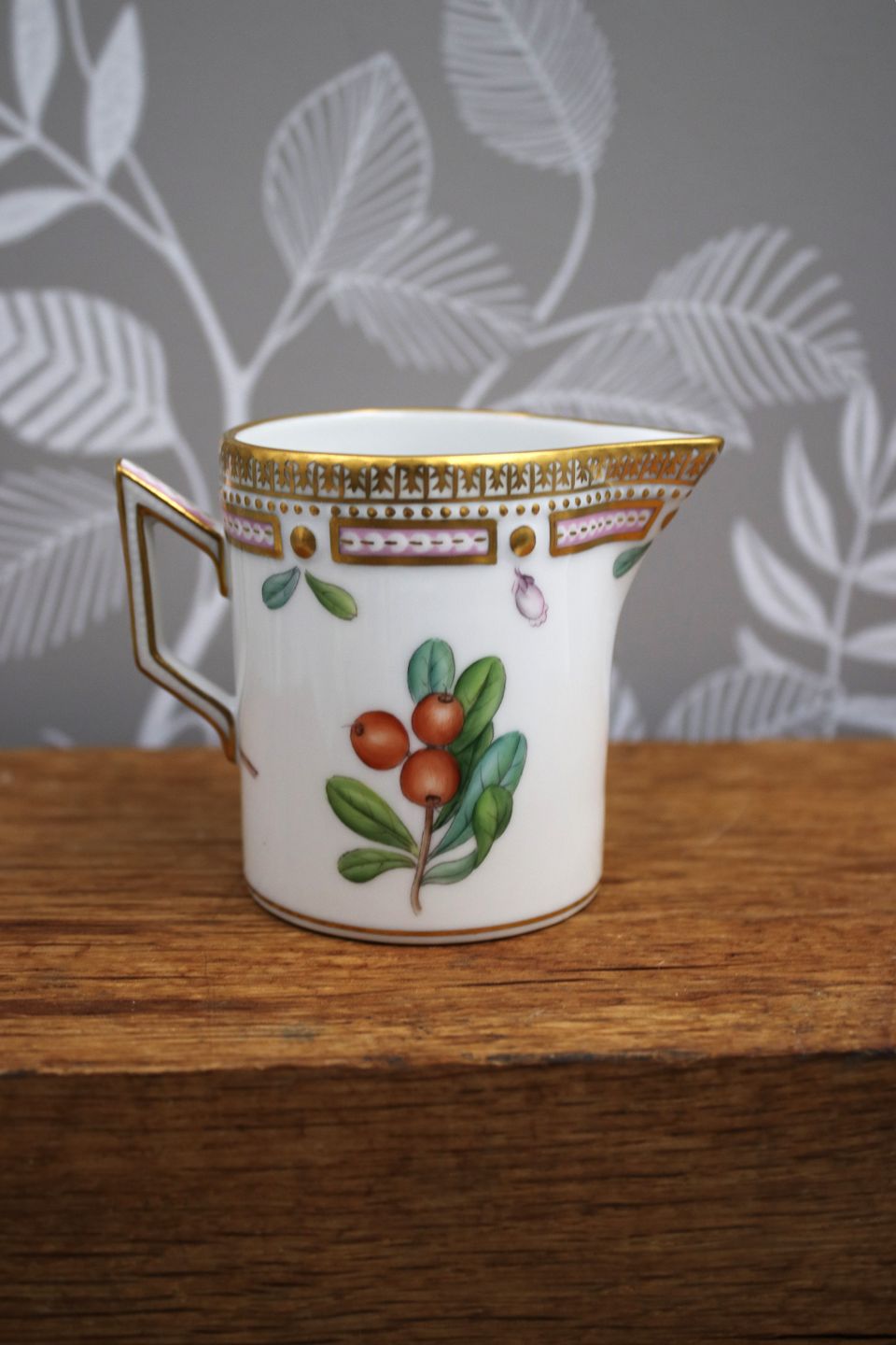 Creamer in Flora Danica set produced by Royal Copenhagen in Denmark. H: 7cm. Dia: 5.5cm. The motif is a hand-painted botanical illustration of the plant Arbutus Uva-ursi. (Mispelris)