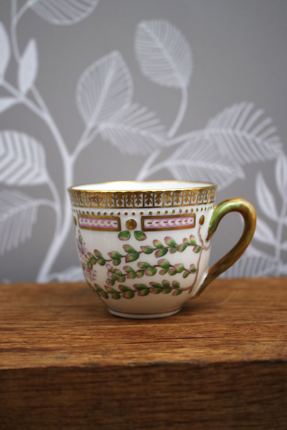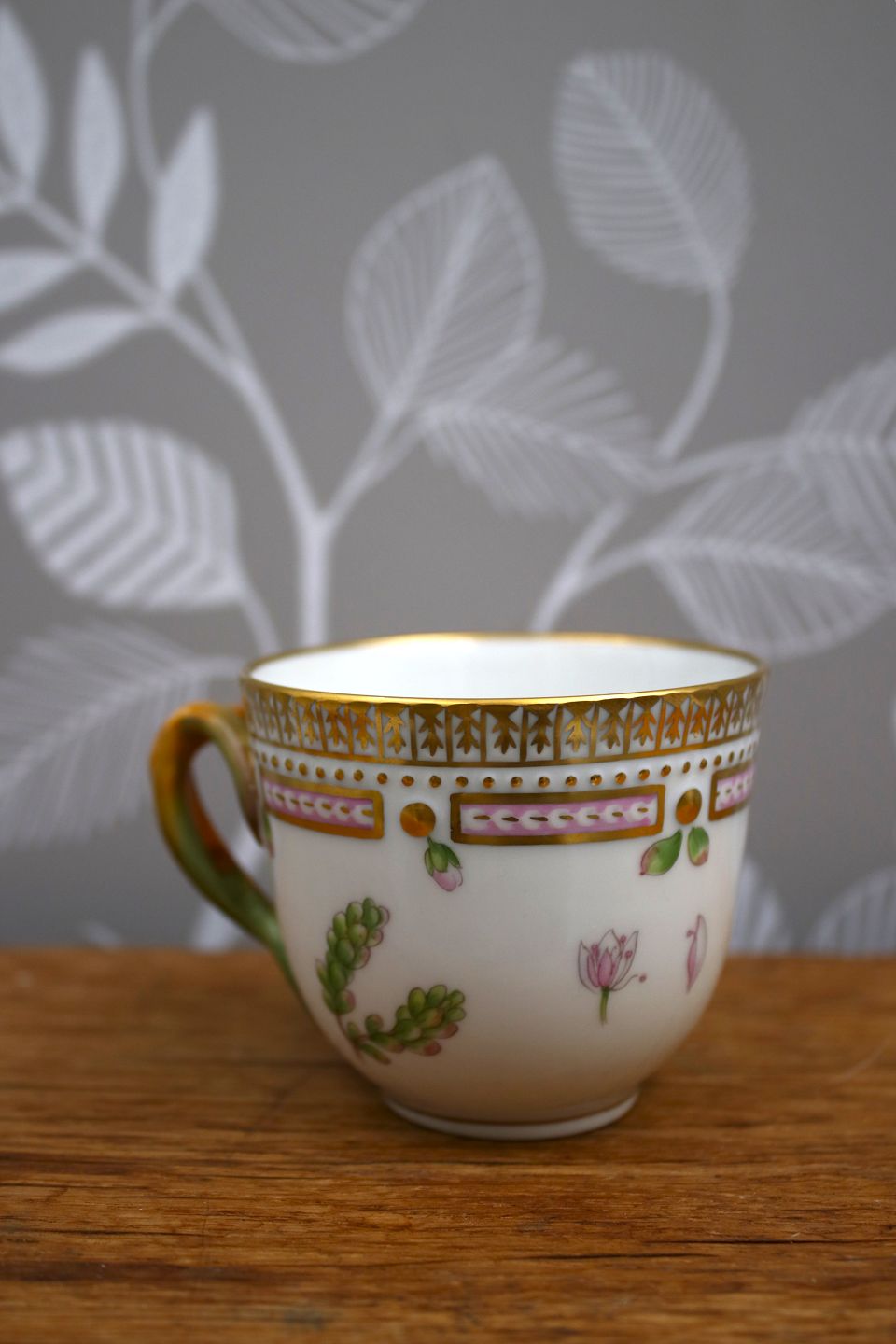 Mocca cup (without saucer) in Flora Danica frame produced by Royal Copenhagen in Denmark. H: 5.5cm. Dia: 6.5cm.