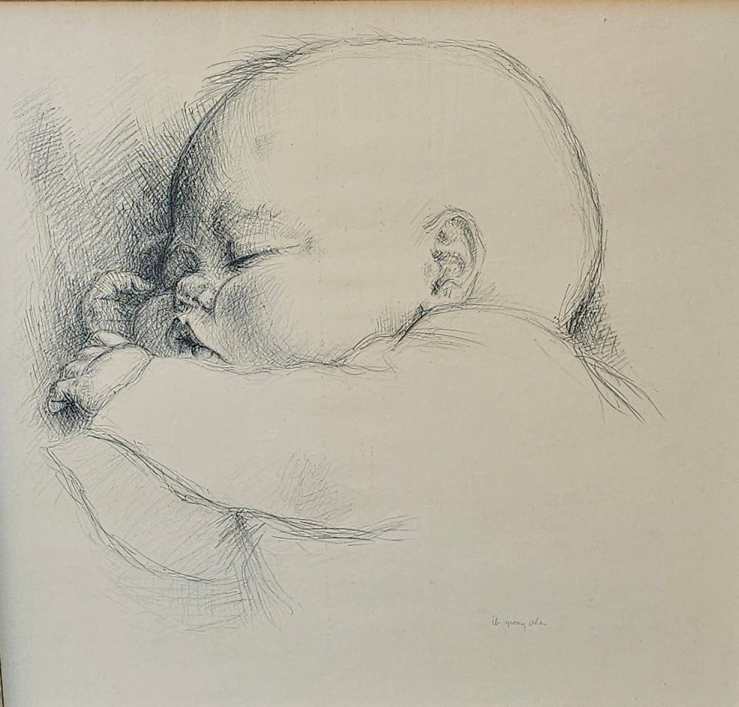 Tryk på papir med motiv af et spædbarn monteret i sølv og sort ramme