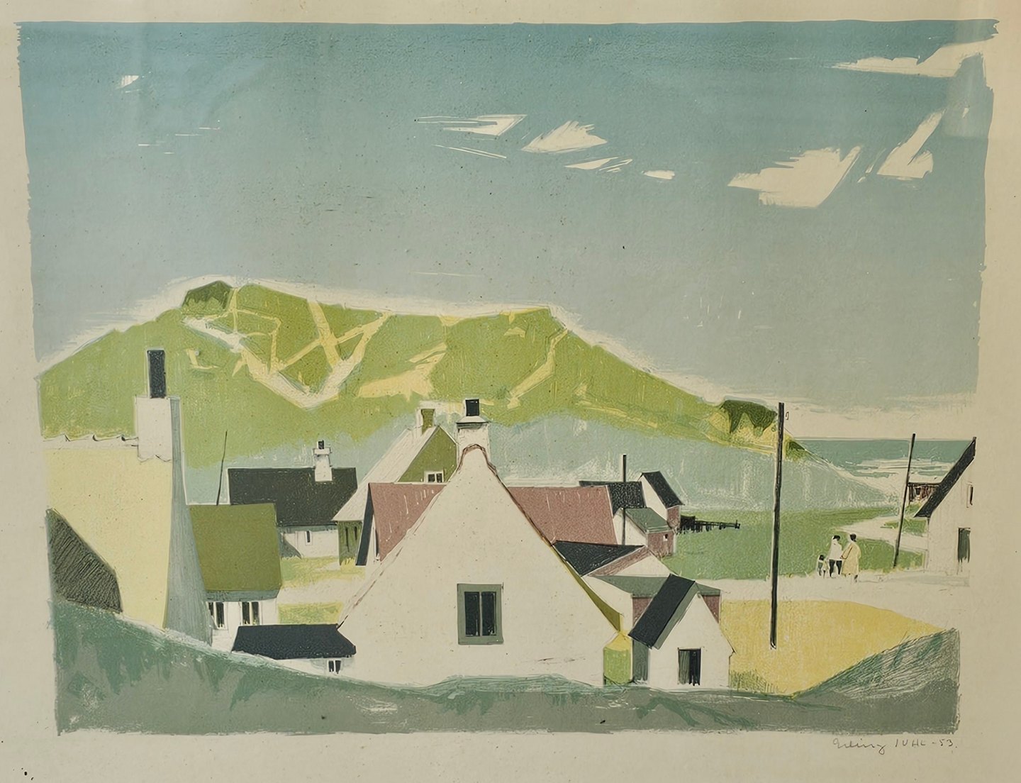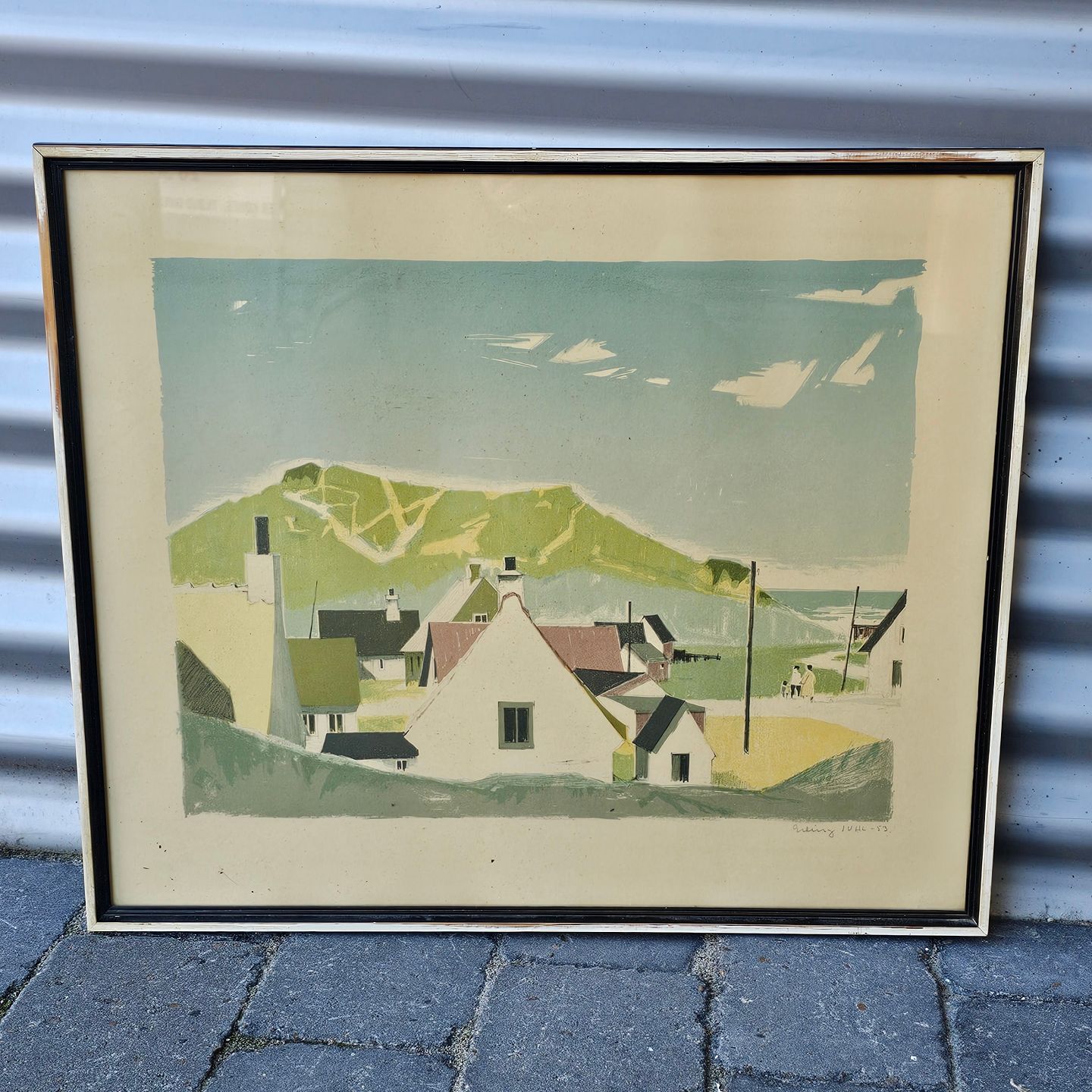 Litografi med titlen Klitter ved Lønstrup med motiv af et dansk sommer landskab monteret i sort og hvid træramme, dateret 1953