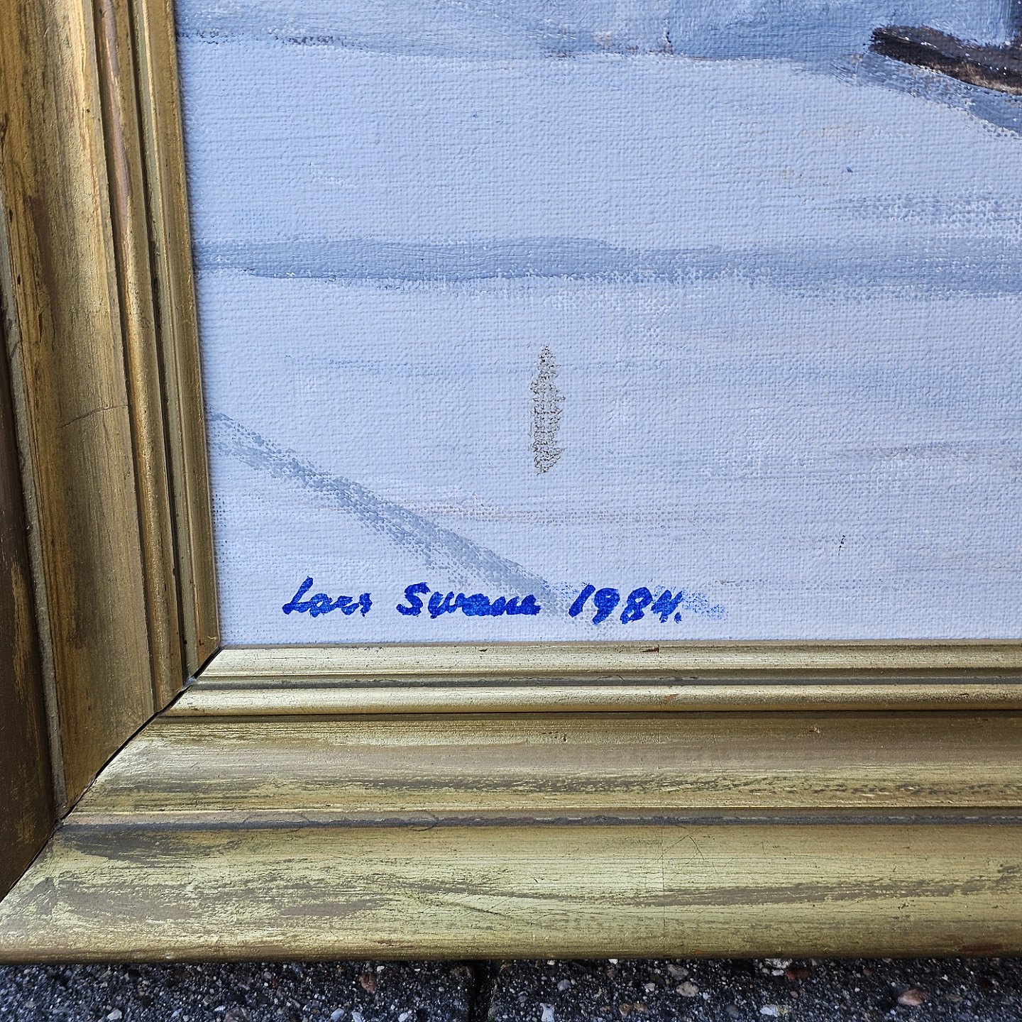 Oliemaleri på lærred med motiv af en havn monteret i guldmalet træramme