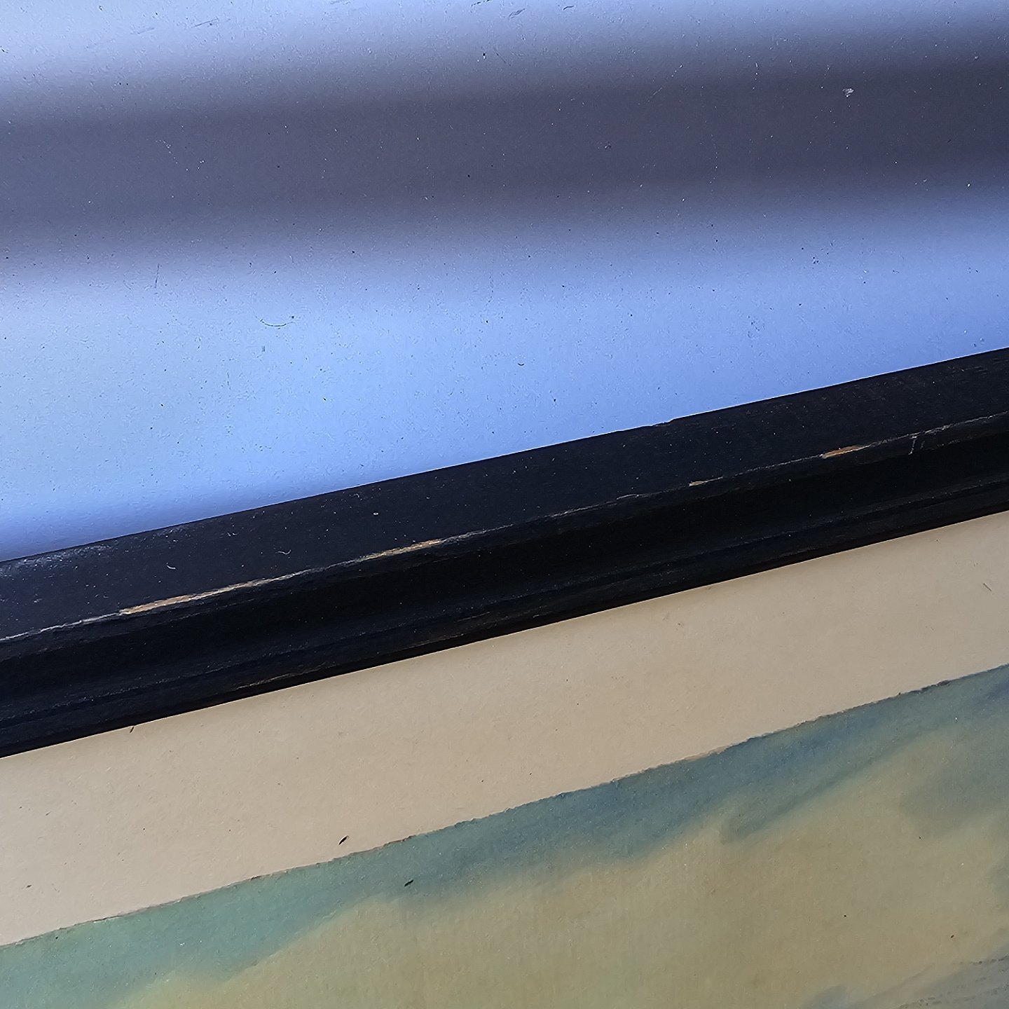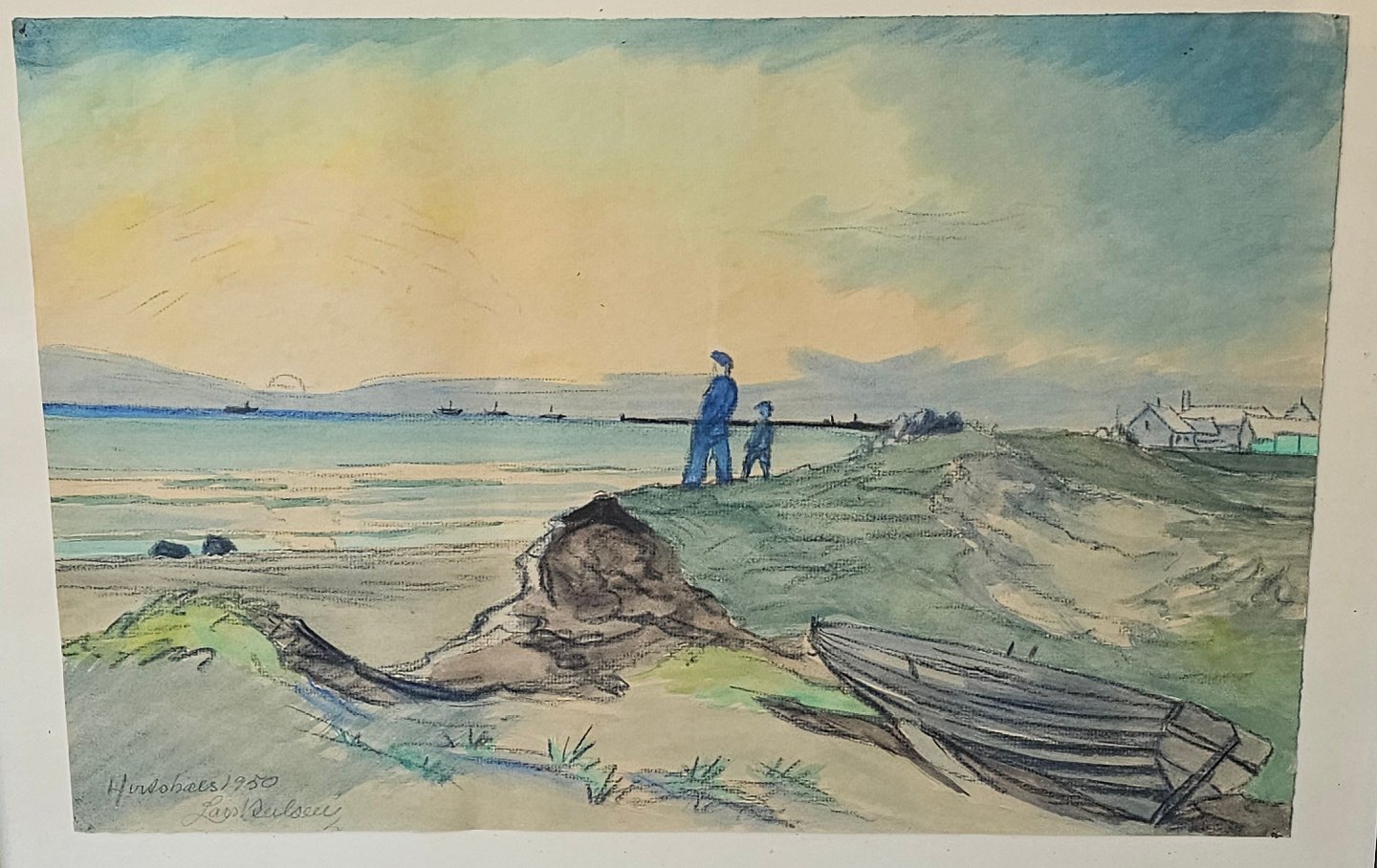 Text available in Danish: Akvarel maleri på papir med motiv af en mand og en dreng, som kigger ud over havet. Monteret i sortmalet træramme, dateret 1950
