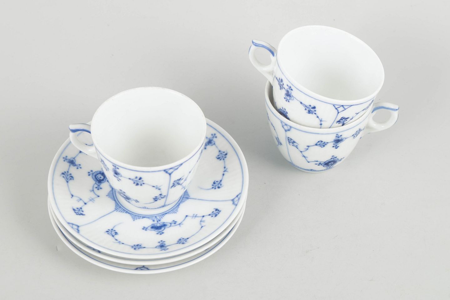 Three coffee cups with matching saucers in porcelain, hand-painted in underglaze blue in the classic Blue Fluted Plain pattern. Model 1/80. First factory quality.