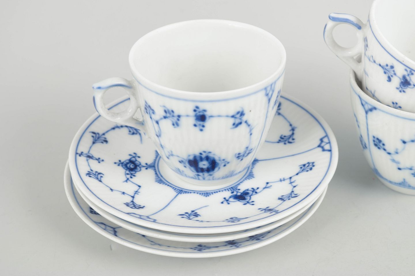 Three coffee cups with matching saucers in porcelain, hand-painted in underglaze blue in the classic Blue Fluted Plain pattern. Model 1/80. Some first factory quality, some factory seconds marked with one or two incised lines.