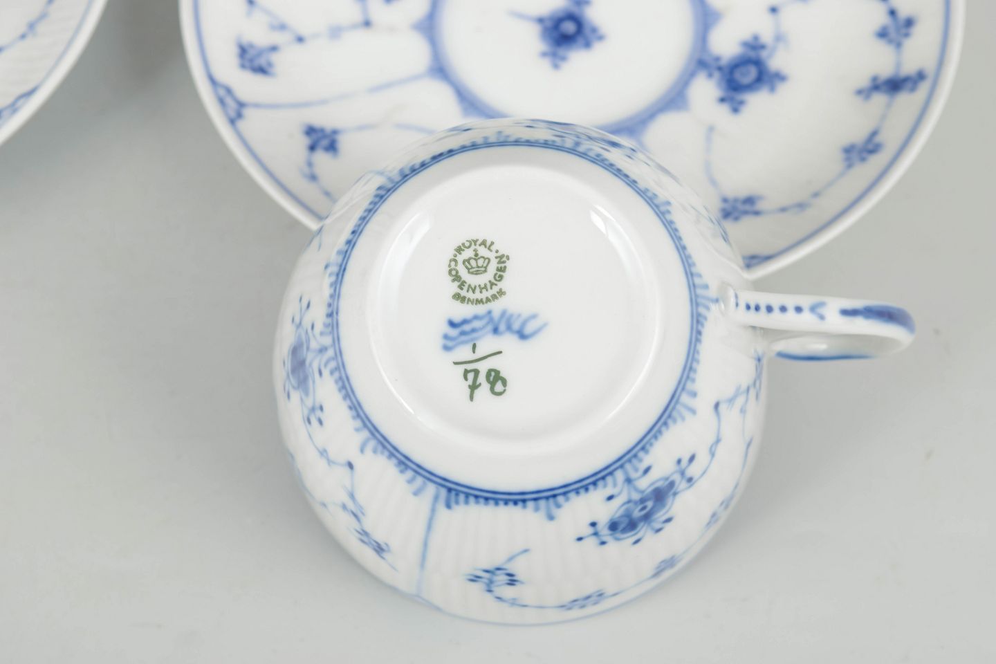 Breakfast cups with matching saucers in porcelain, hand-painted in underglaze blue in the classic Blue Fluted Plain pattern. Rare. Model 1/78. First factory quality.