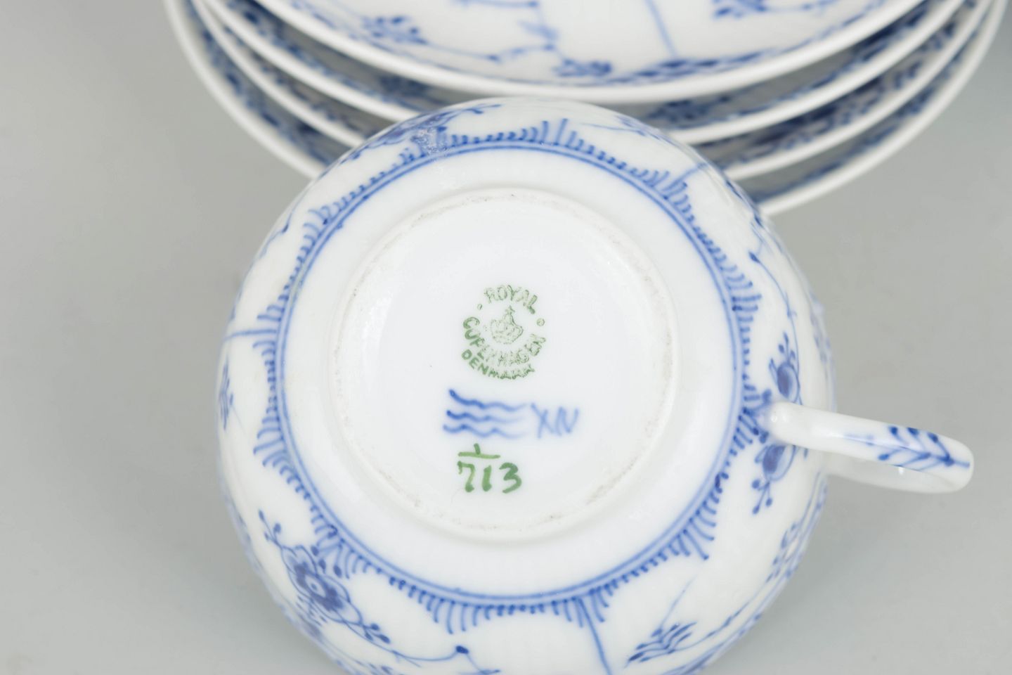 Coffee cups with matching saucers in porcelain, hand-painted in underglaze blue in the classic Blue Fluted Half Lace pattern. Model 1/713. First factory quality.