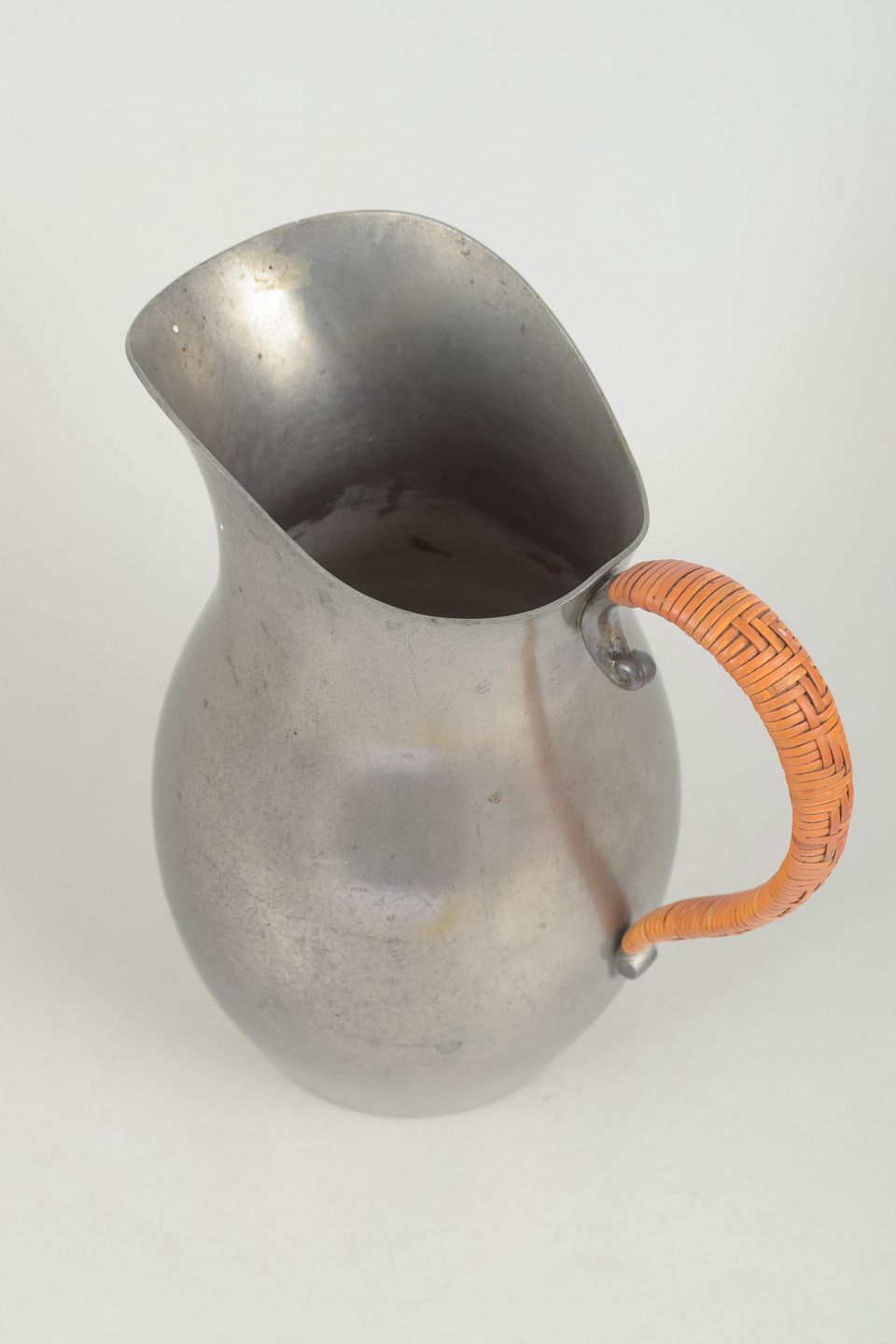 Large pitcher in pewter with wicker handle and softly curved body, executed in an elegant art deco design. Model 502.