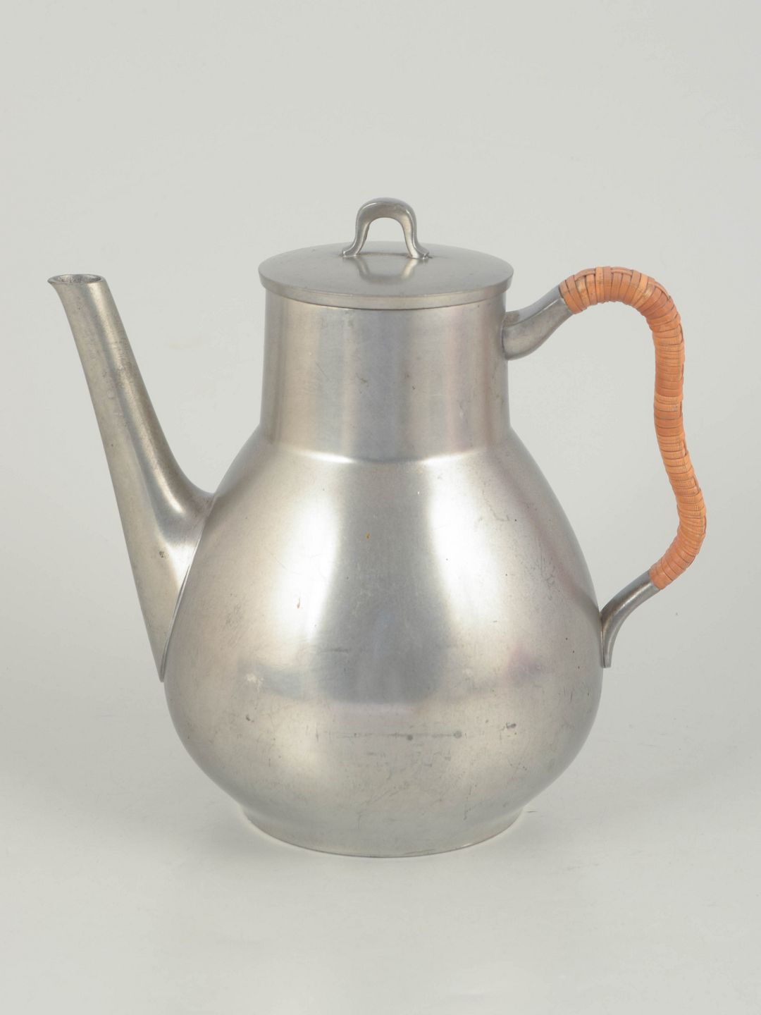 Coffee pot in pewter with wicker handle and an elegant rounded body, executed in a refined art deco design. Model 2661.