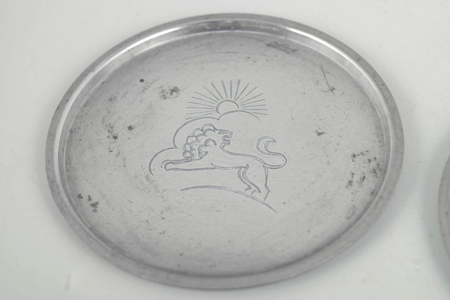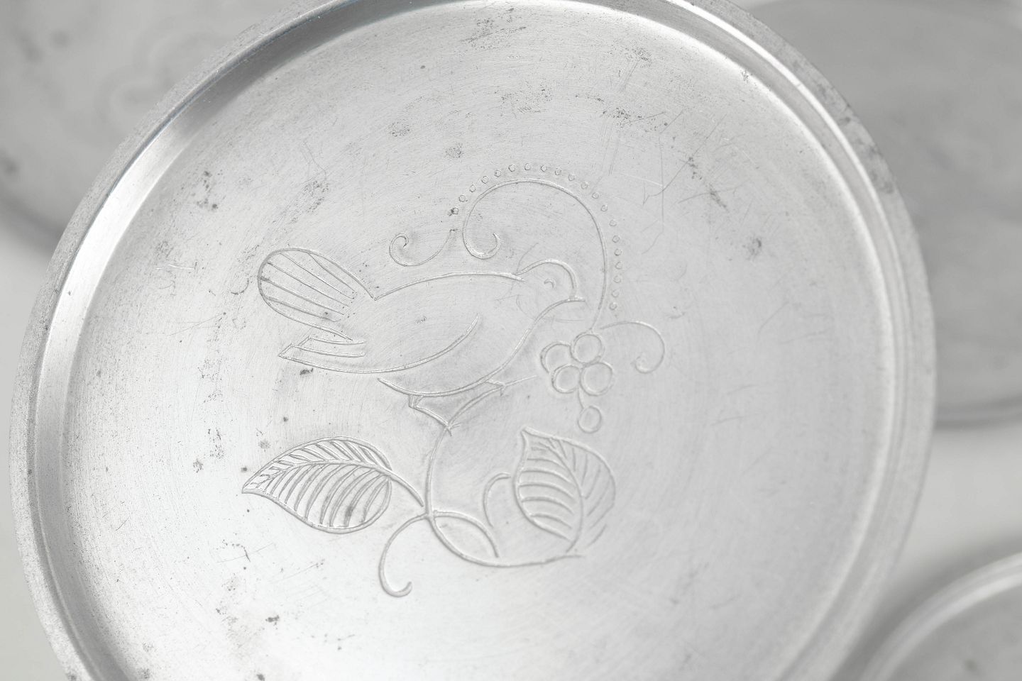 Set of five coasters in pewter with engraved animal motifs in a stylised art deco design. Model 1176.
