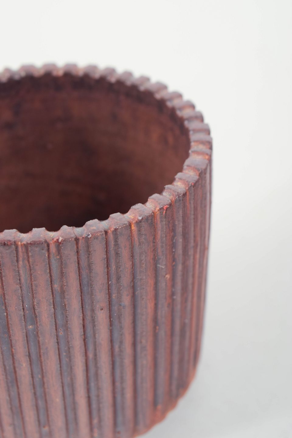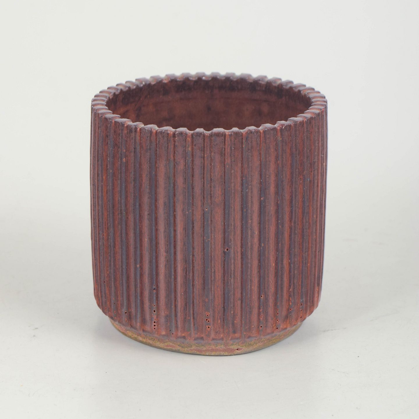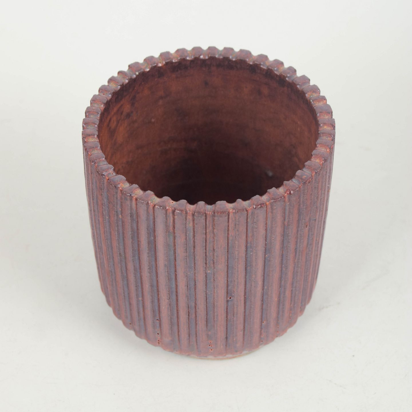 Cylindrical stoneware vase with vertical fluting and a deep brown-purple glaze with warm tonal variations.