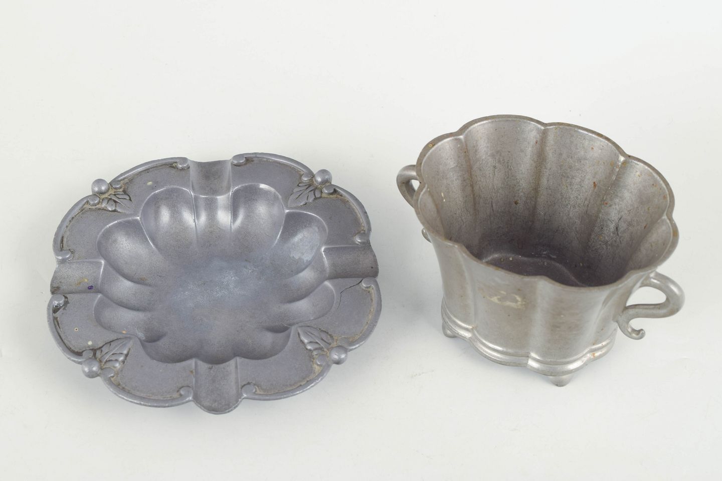 Vase and dish in pewter, executed in an elegant art deco design with soft curves and stylised details. Vase model 46. Dish model 1214.