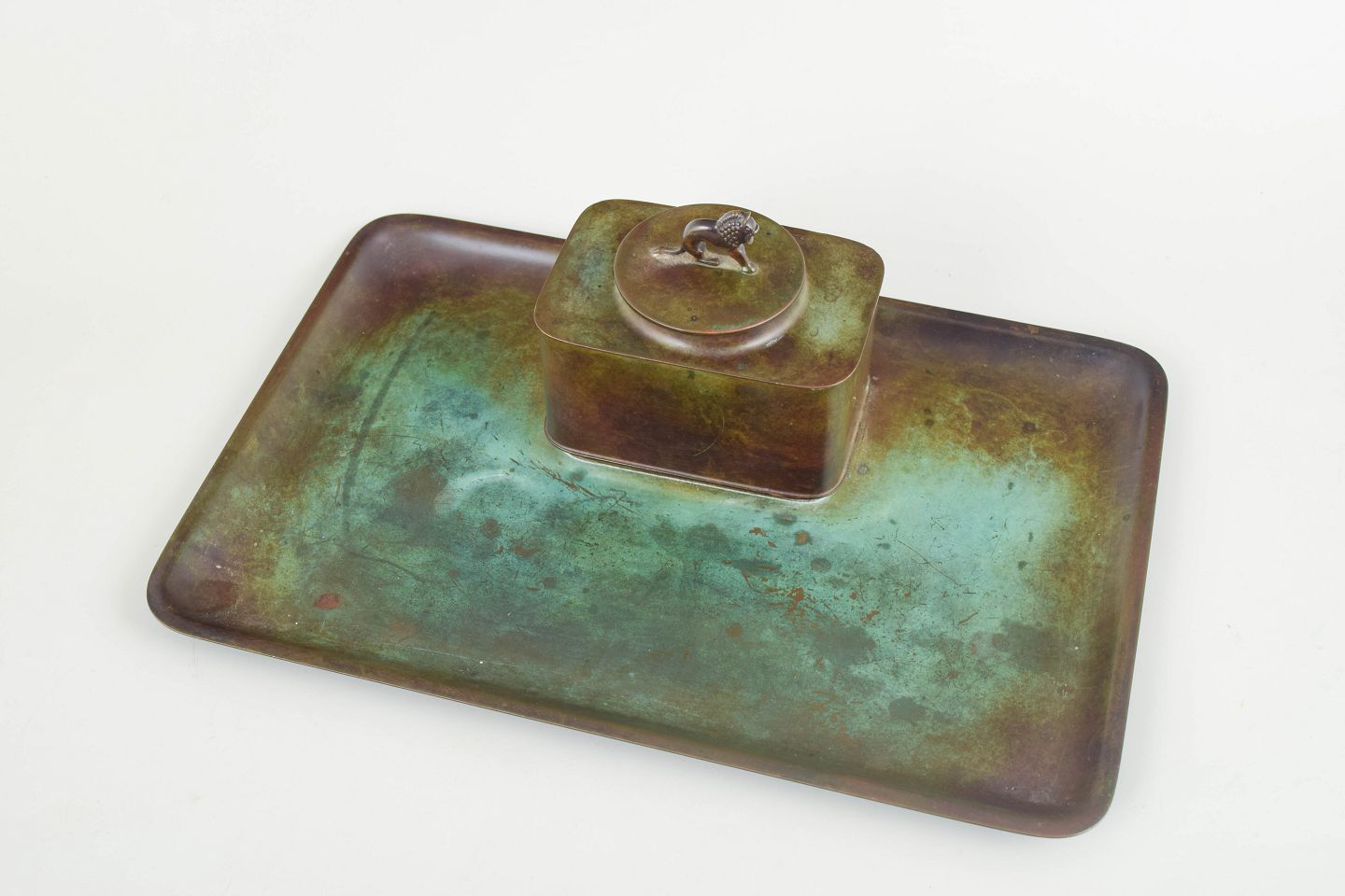 Ink well in alloyed bronze with a rectangular tray, square container with lid, and original glass insert. Model LB 1820.
