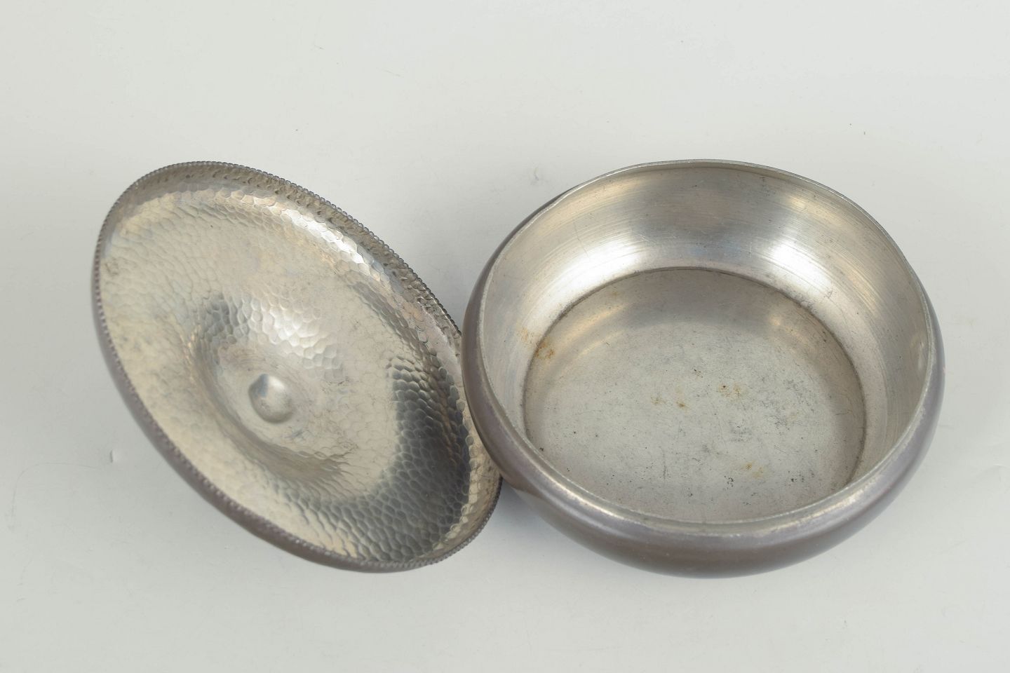 Art deco pewter lidded bowl with a rounded, soft form and lid topped with a decorative figural finial.