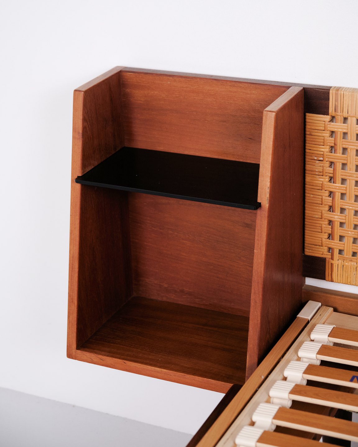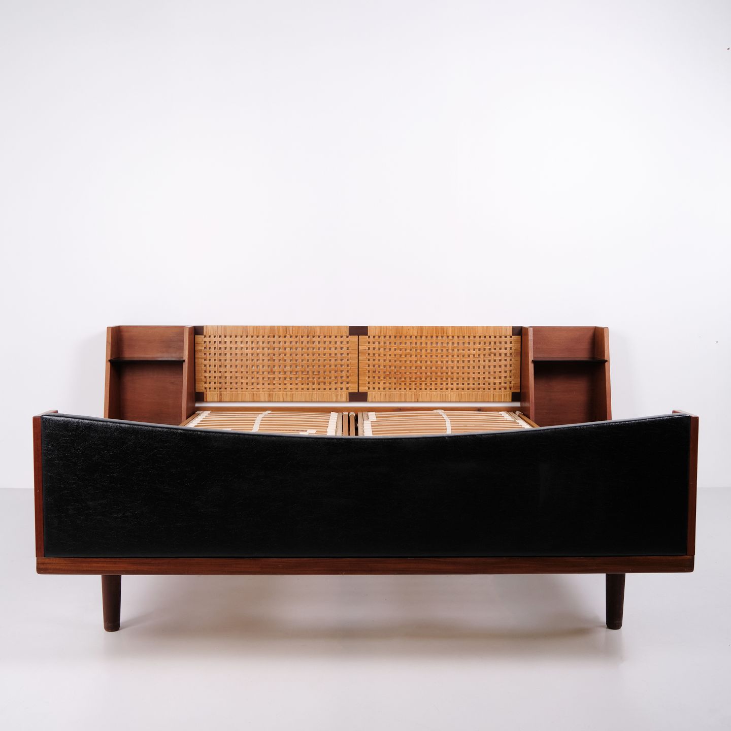 Model GE 701 double bed designed by Hans J. Wegner and manufactured by Getama in the 1950s. Crafted in veneered and solid teak. Headboard and footboard with cane weaving and black faux leather. Headboard with integrated bedside tables featuring black glass shelves and lower shelf. Brass fittings. Hans J. Wegner collaborated with Getama for many years and designed several teak furniture models for home interiors and bedrooms.