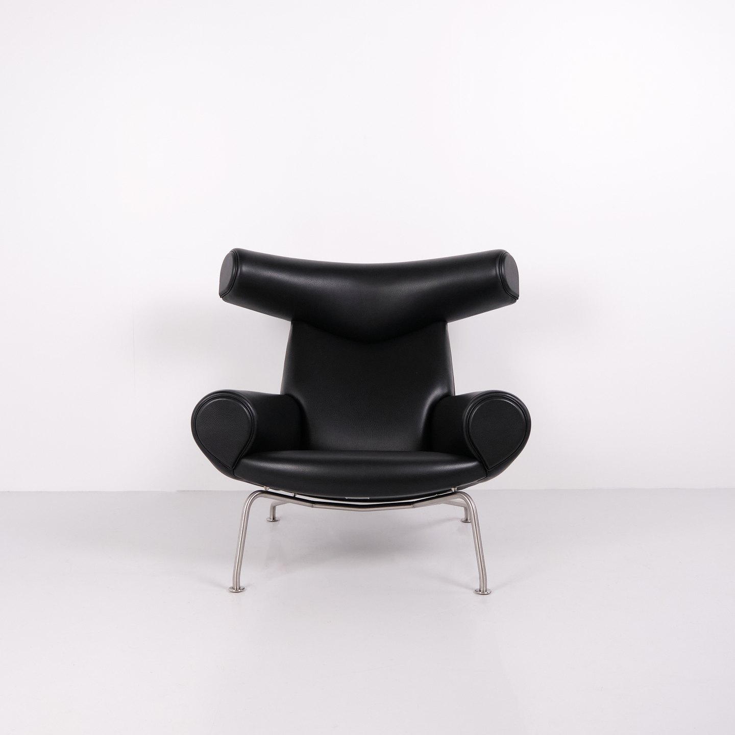 Ox Chair model EJ100 with matching ottoman designed by Hans J. Wegner. The model was designed in 1960 and is produced today by Fredericia Furniture following the acquisition of Erik Jørgensen. Upholstered in black leather with steel frame. The distinctive backrest with “horns” gave the chair its name Ox Chair. The design is considered one of Wegner’s most sculptural works and differs from many of his other chairs through its bold and organic form. The Ox Chair is represented in international collections and is among the most recognized Danish lounge chairs of the period.