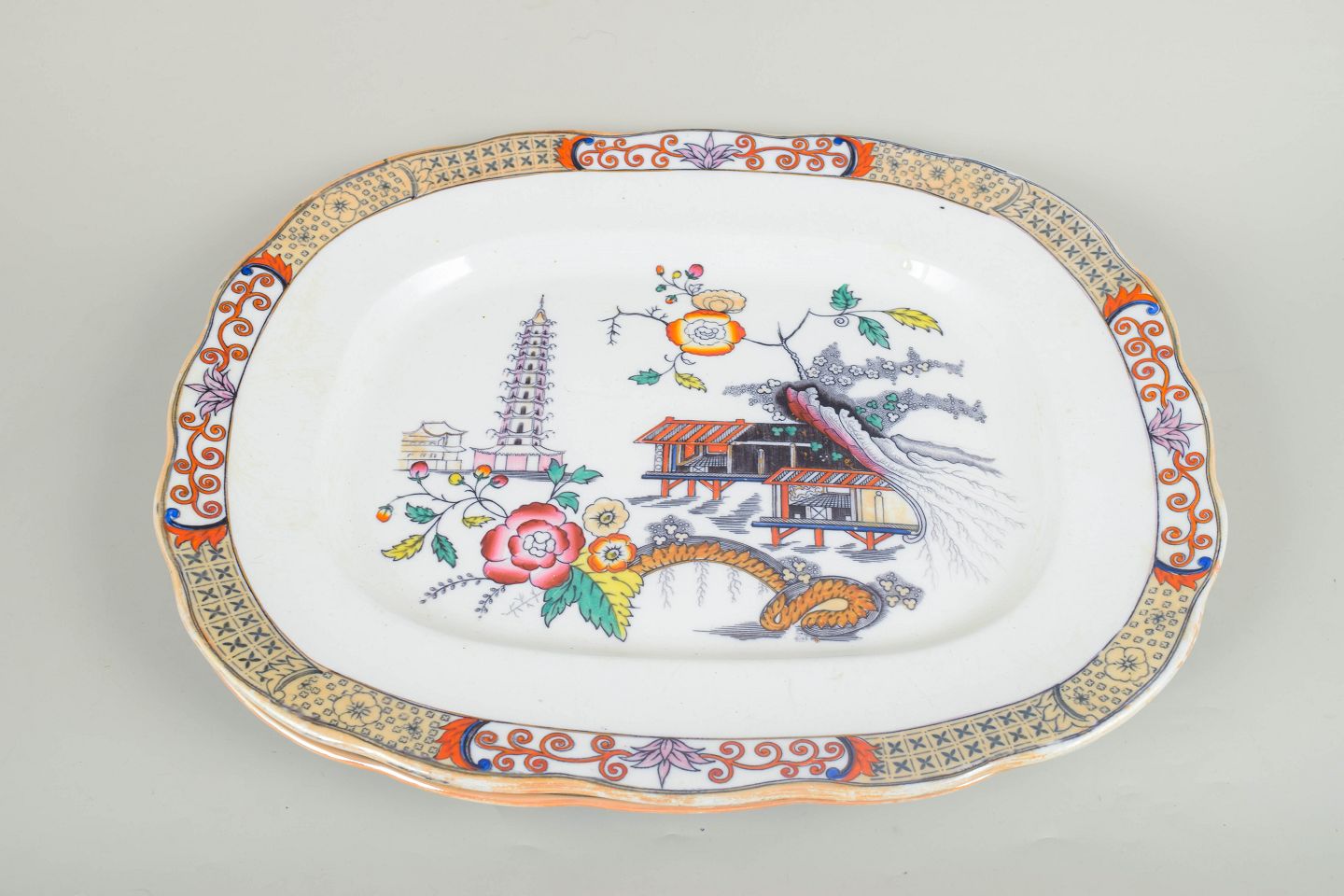 Large serving dishes in faience with oriental-inspired decoration in polychrome colours and finely detailed painting in Japanese style, characteristic of Rörstrand’s japonisme production from the early 20th century.