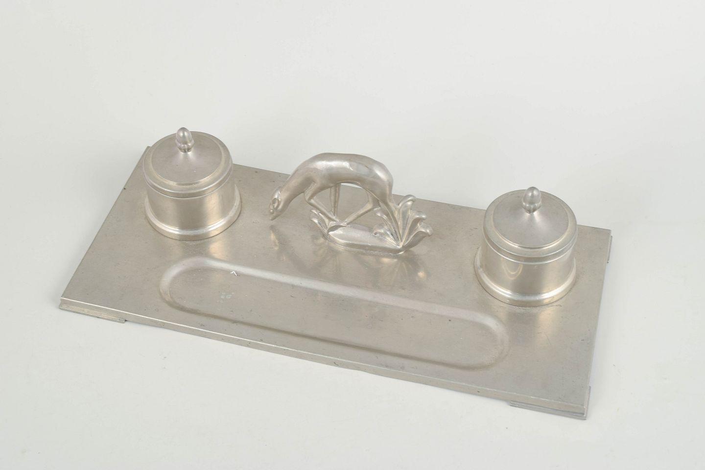 Rectangular pewter ink well with two containers and a sculptural deer figure at the centre. One glass insert is missing. Marked on the base.