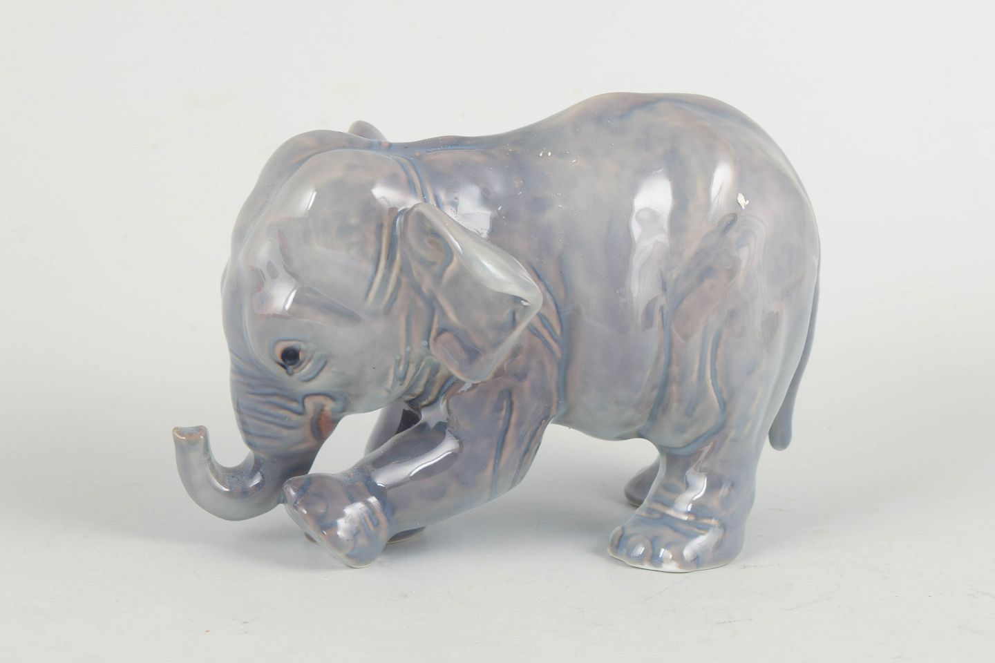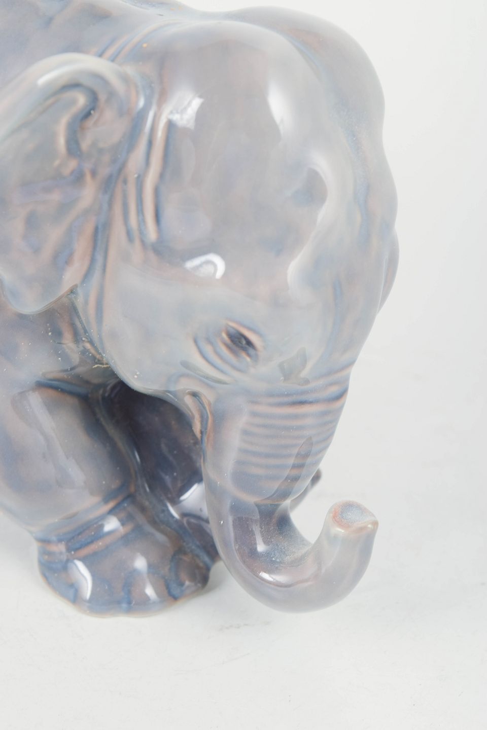 Naturalistically modelled elephant in porcelain model 2575 with a soft, iridescent glaze in grey and bluish tones. Finely detailed surface and marked as first factory quality on the base.