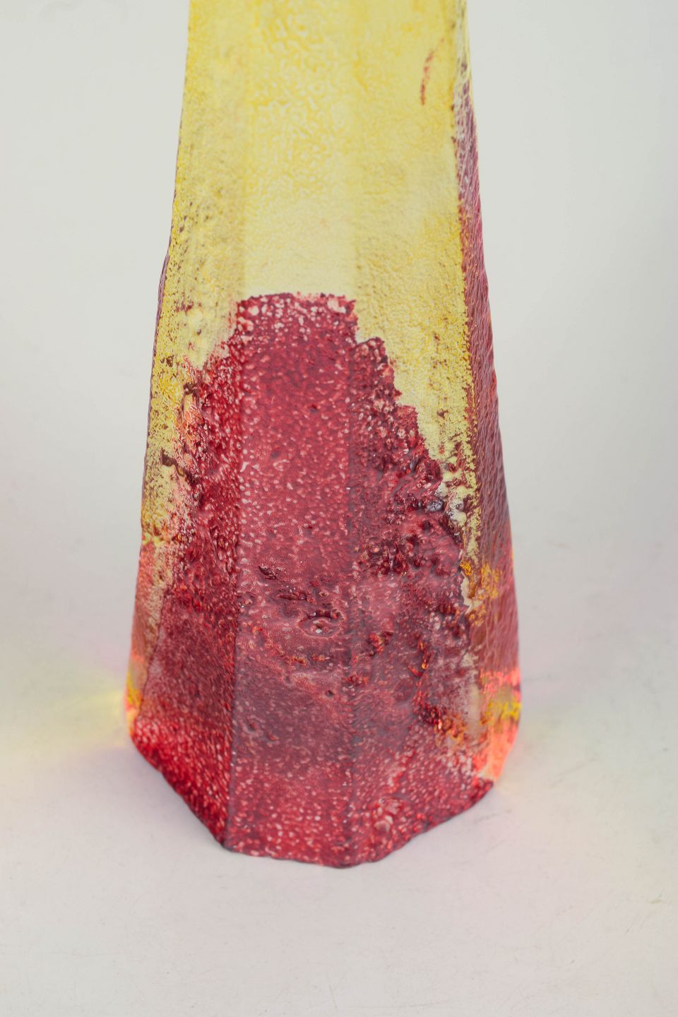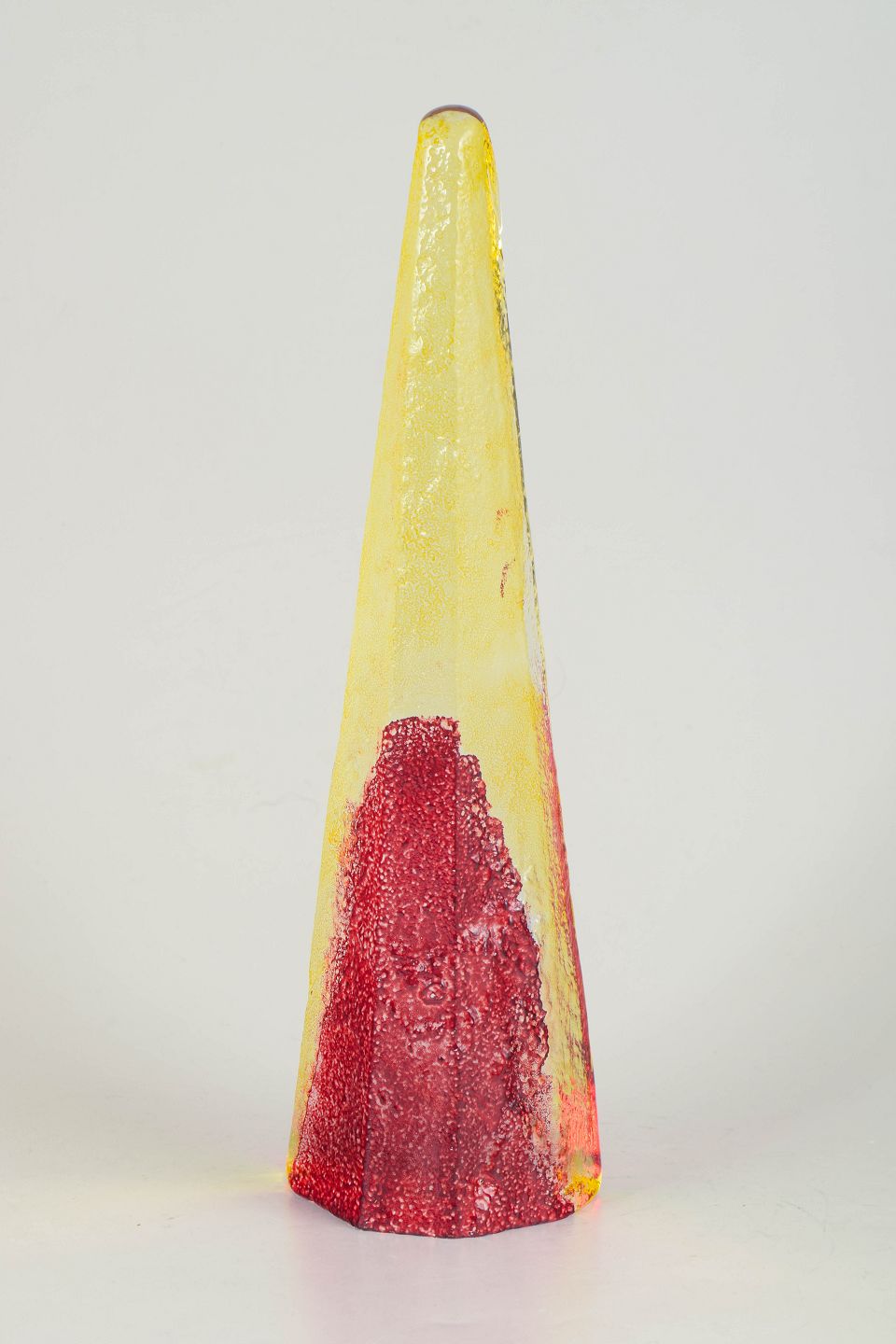 Tall conical sculptural form in mouth-blown glass with encased colours in yellow, red and clear tones. Signed Bergdala B. Hultqvist.