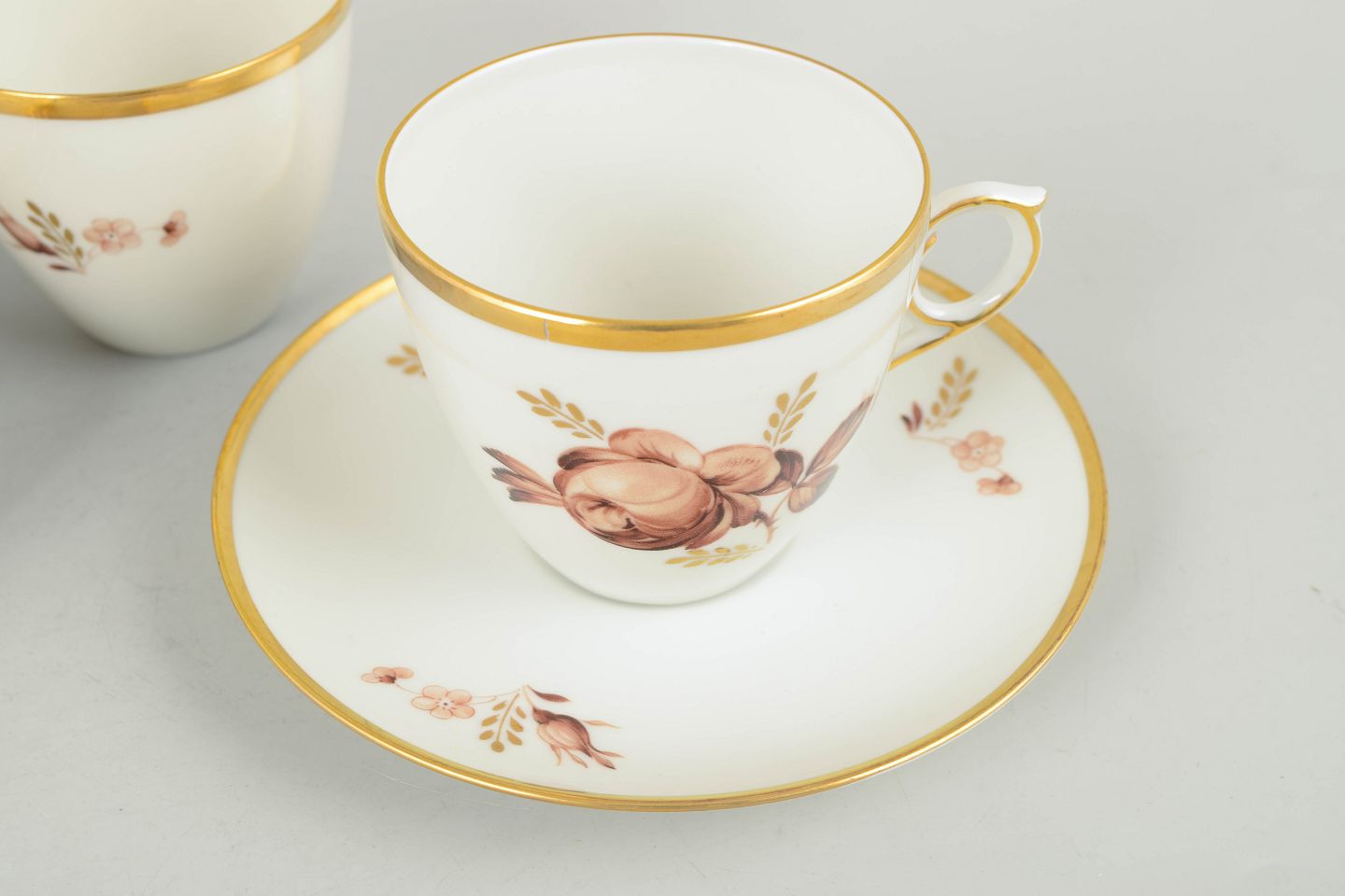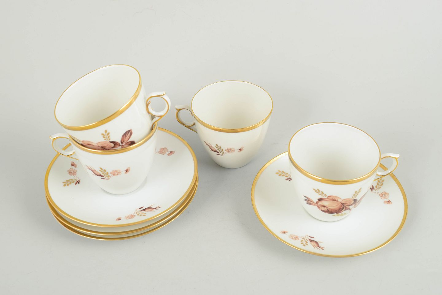 Coffee cups with matching saucers in white porcelain with brown floral decoration and gilded rim, model 688/9069, from the 1970s, first factory quality.