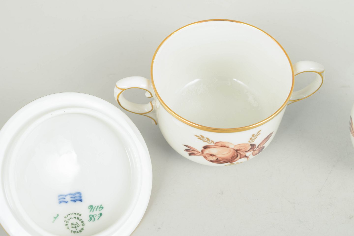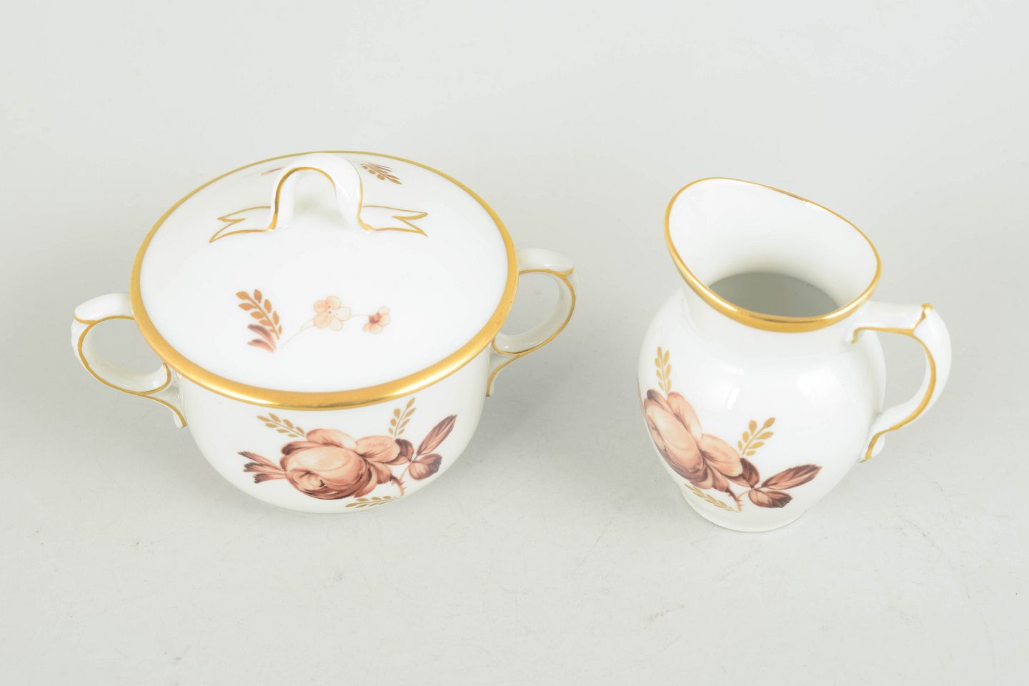 Set consisting of a creamer and sugar bowl in white porcelain with brown floral decoration and gilded rim, models 688/9228 and 688/9116, from the 1970s, first factory quality.