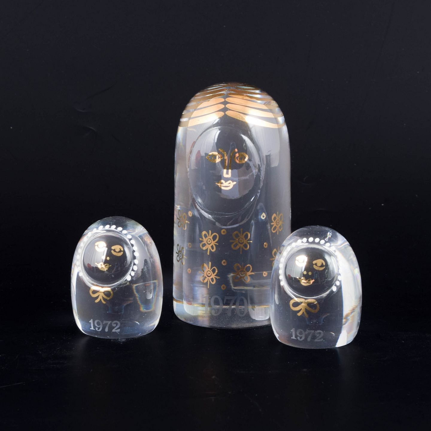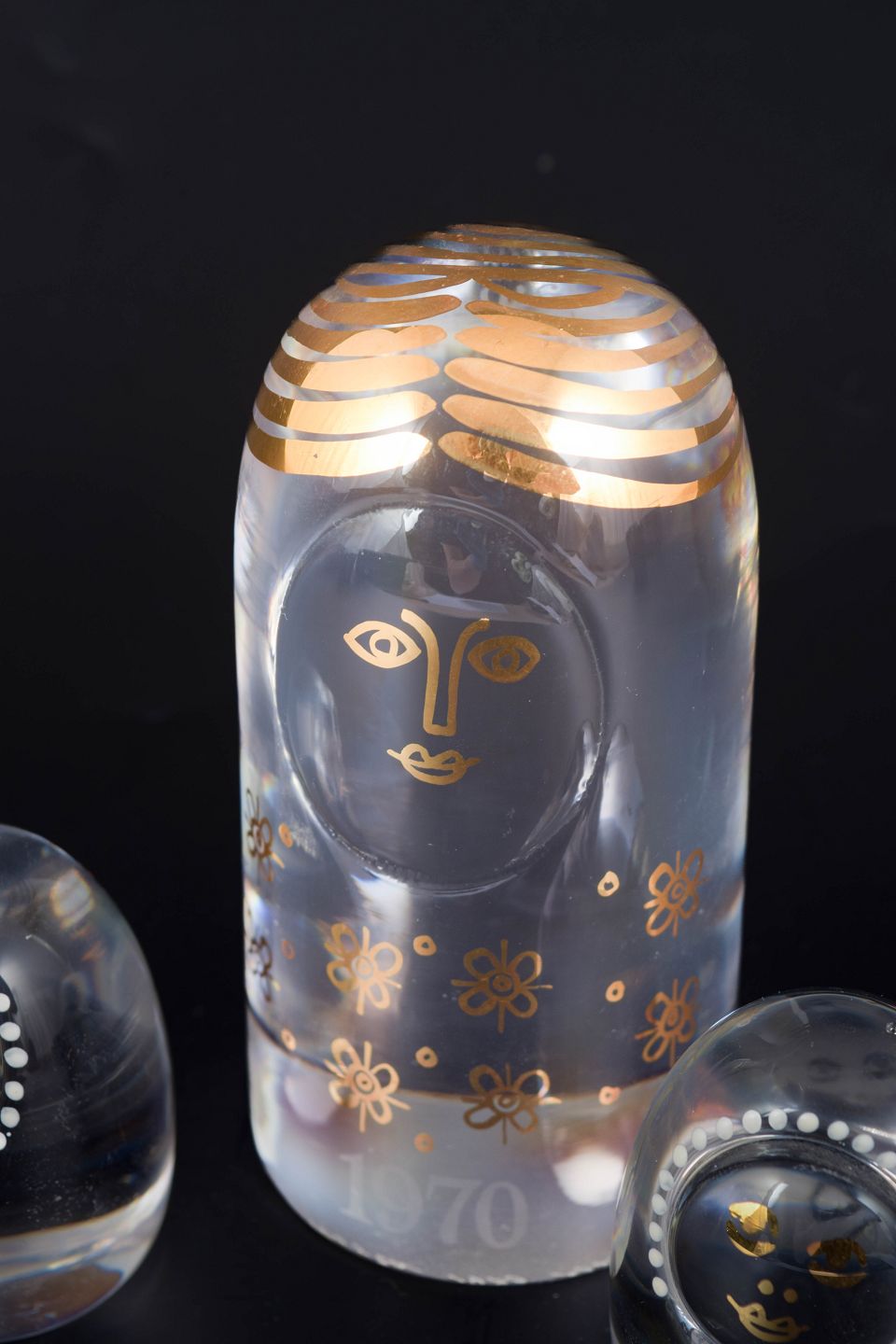 Handmade art glass figures in clear glass with stylised faces and decorative white and gilt floral motifs, formed as a smaller family group.
