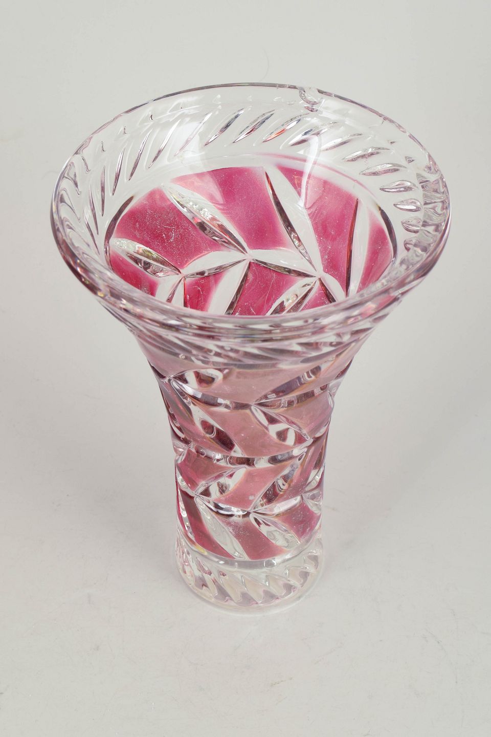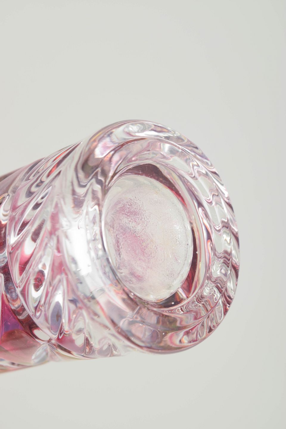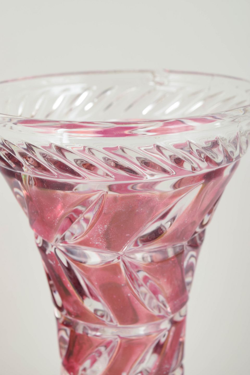 Pressed and cut crystal in clear and pink tinted glass with spiral and geometric cut decoration.