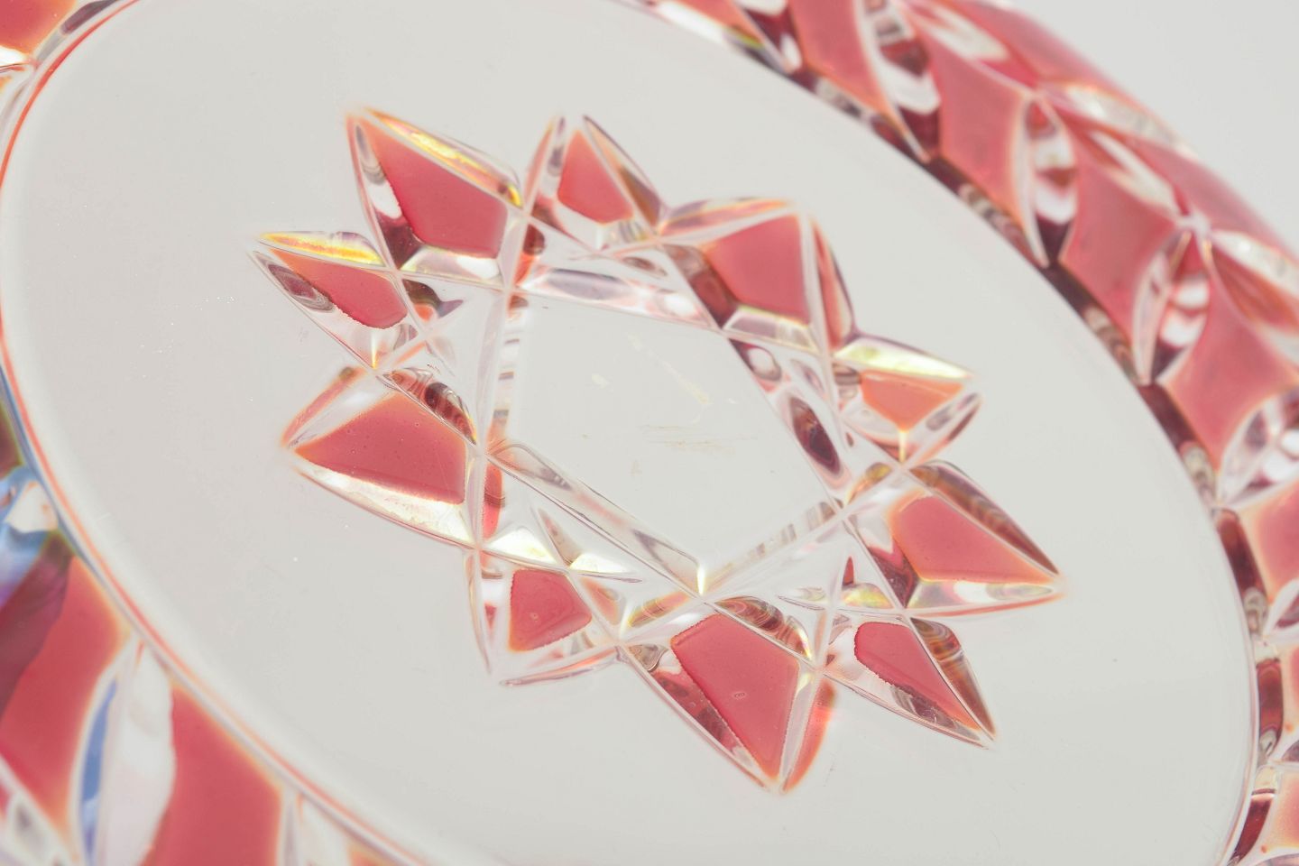 Pressed and cut crystal dishes in clear and pink tinted glass with geometric star pattern and faceted edges.