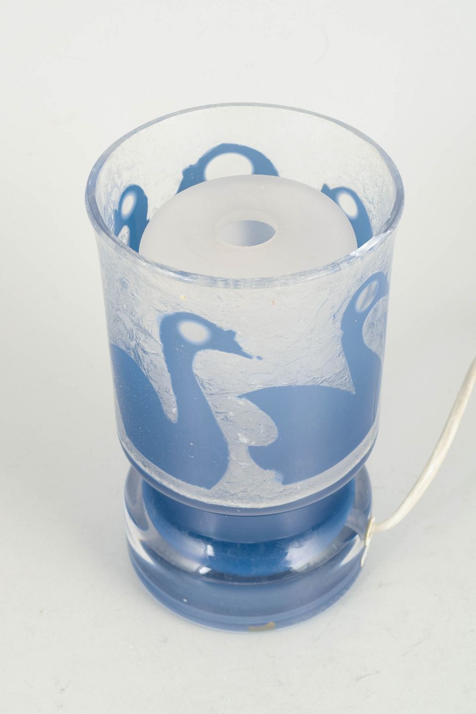 Decorative art glass table lamp with a frosted surface and blue swan motif, mounted on a clear and blue glass base. Signed underneath.