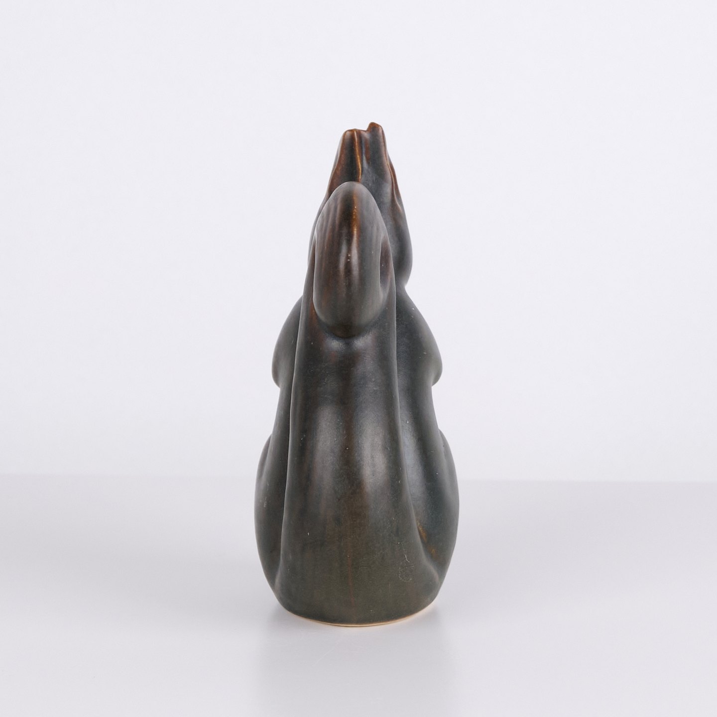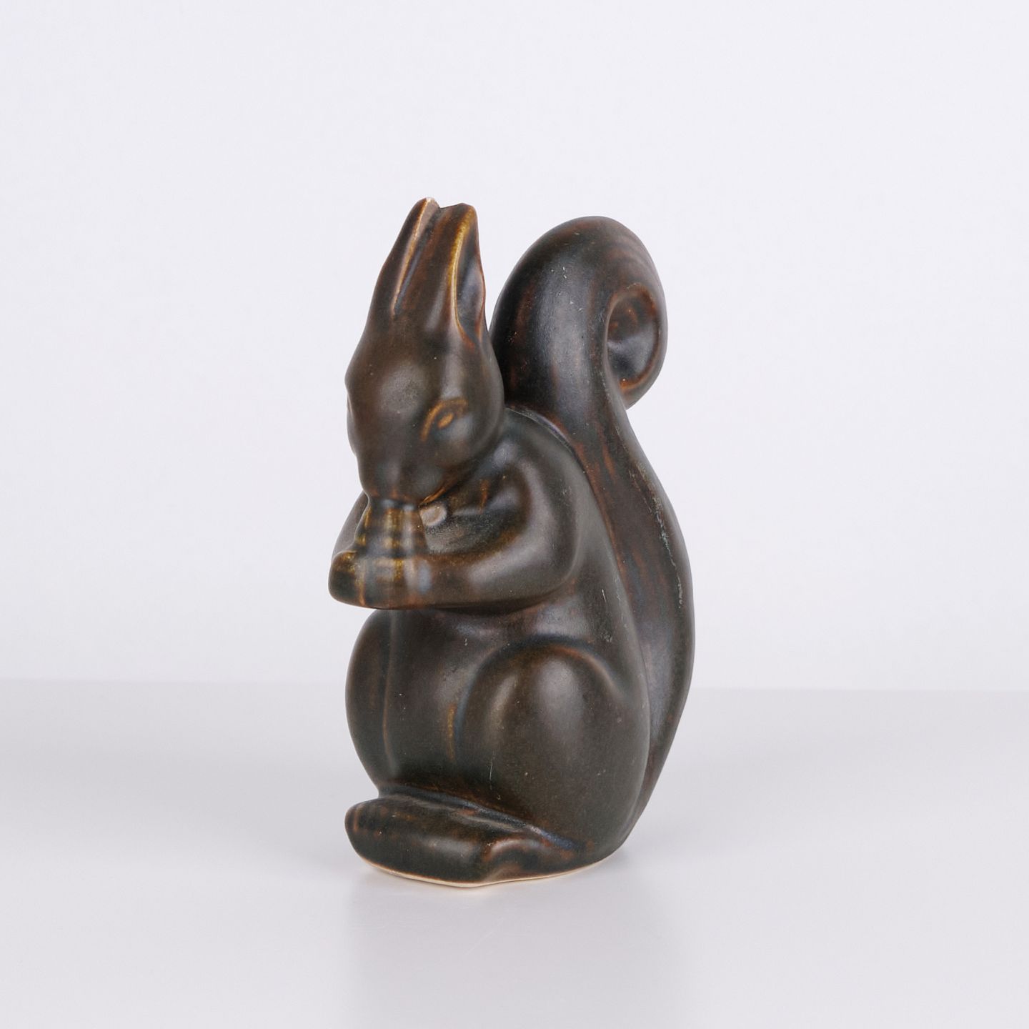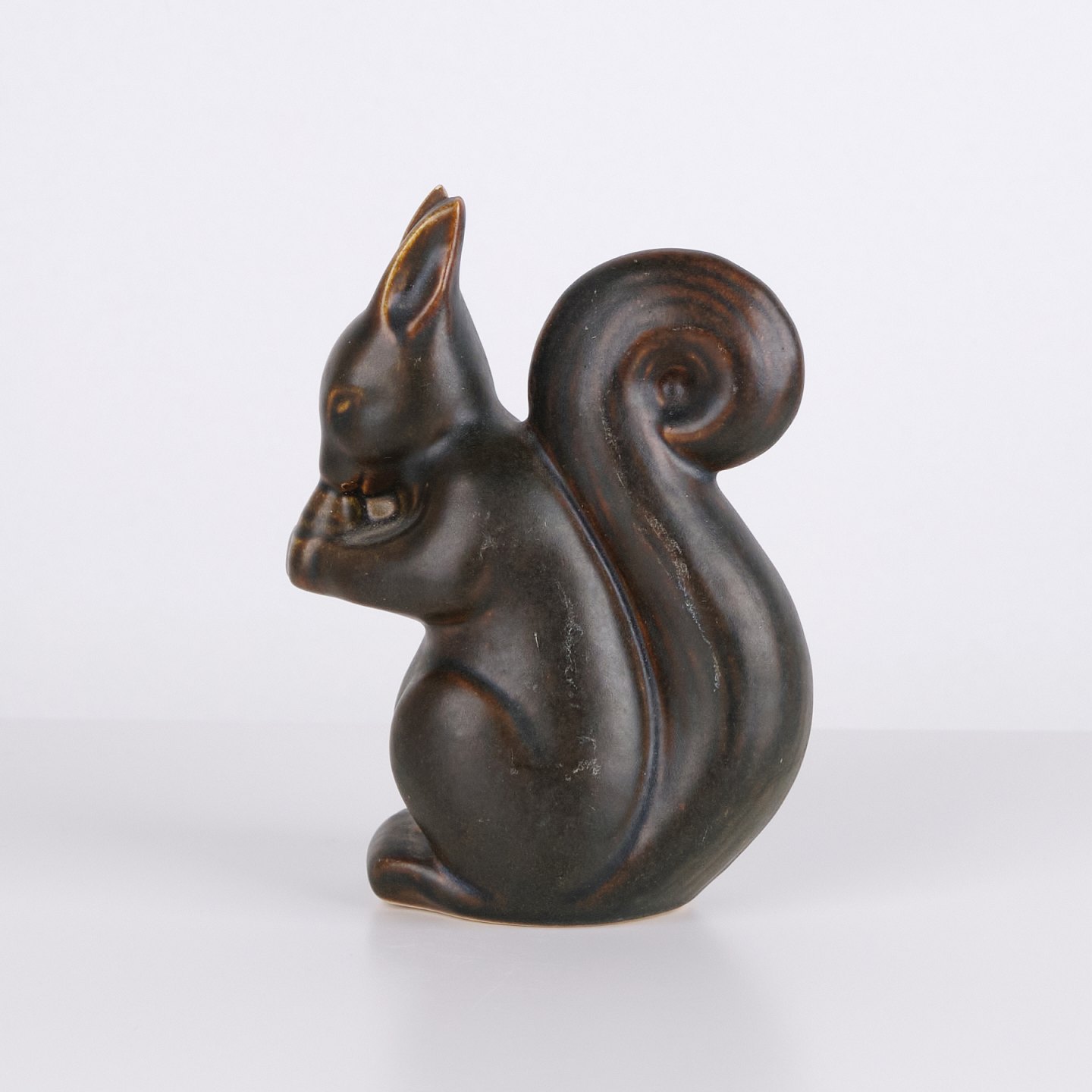 Ceramic squirrel figure by Knud Basse made in dark glaze with warm brown tones. The figure depicts a seated squirrel with nut and features marked organic lines characteristic of Danish studio pottery from the period. Knud Basse figures are known collector’s items within Danish animal ceramics.