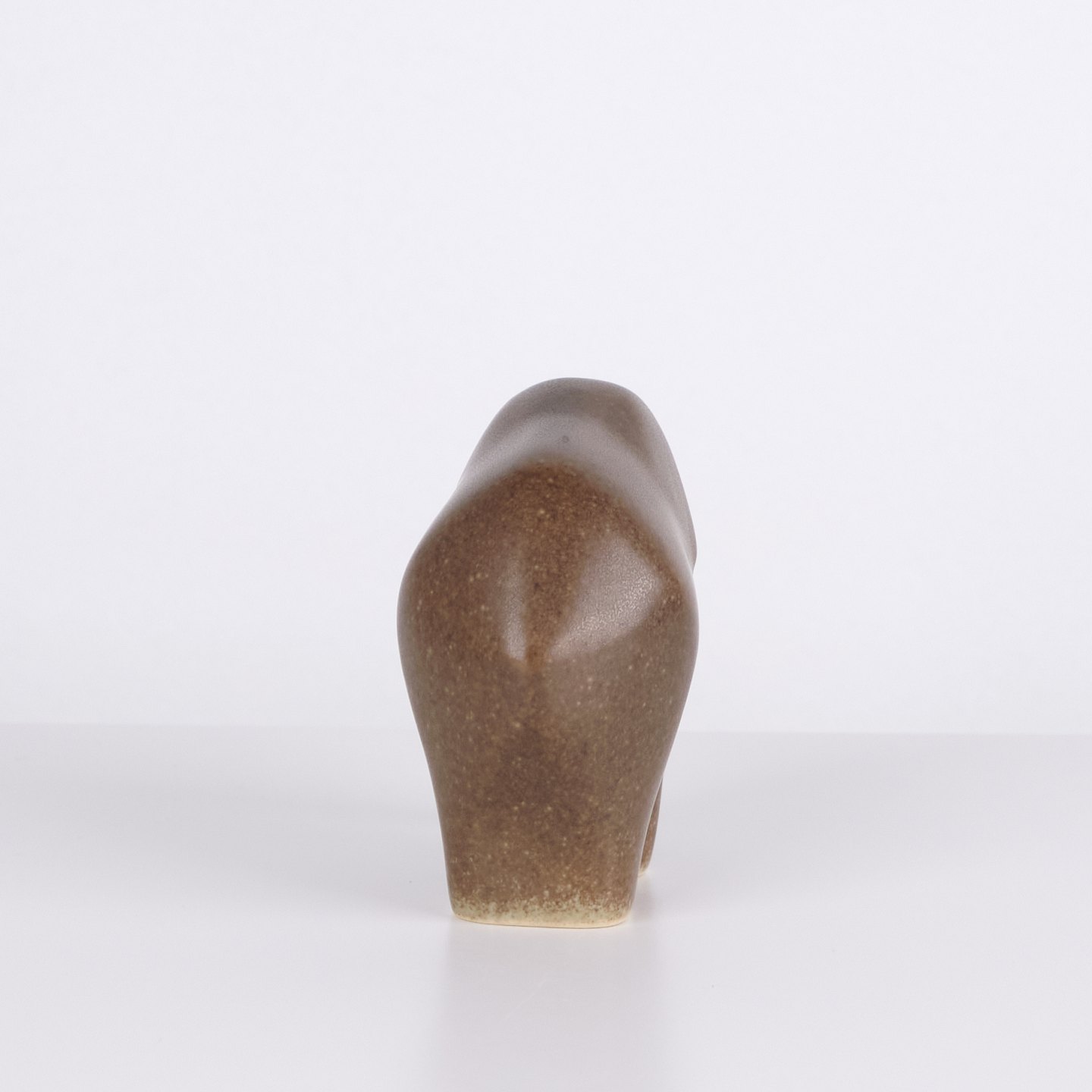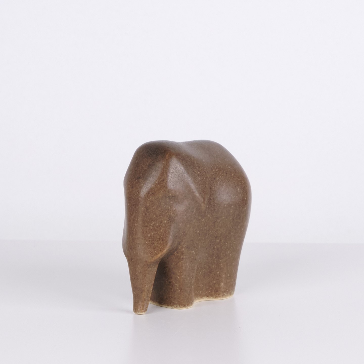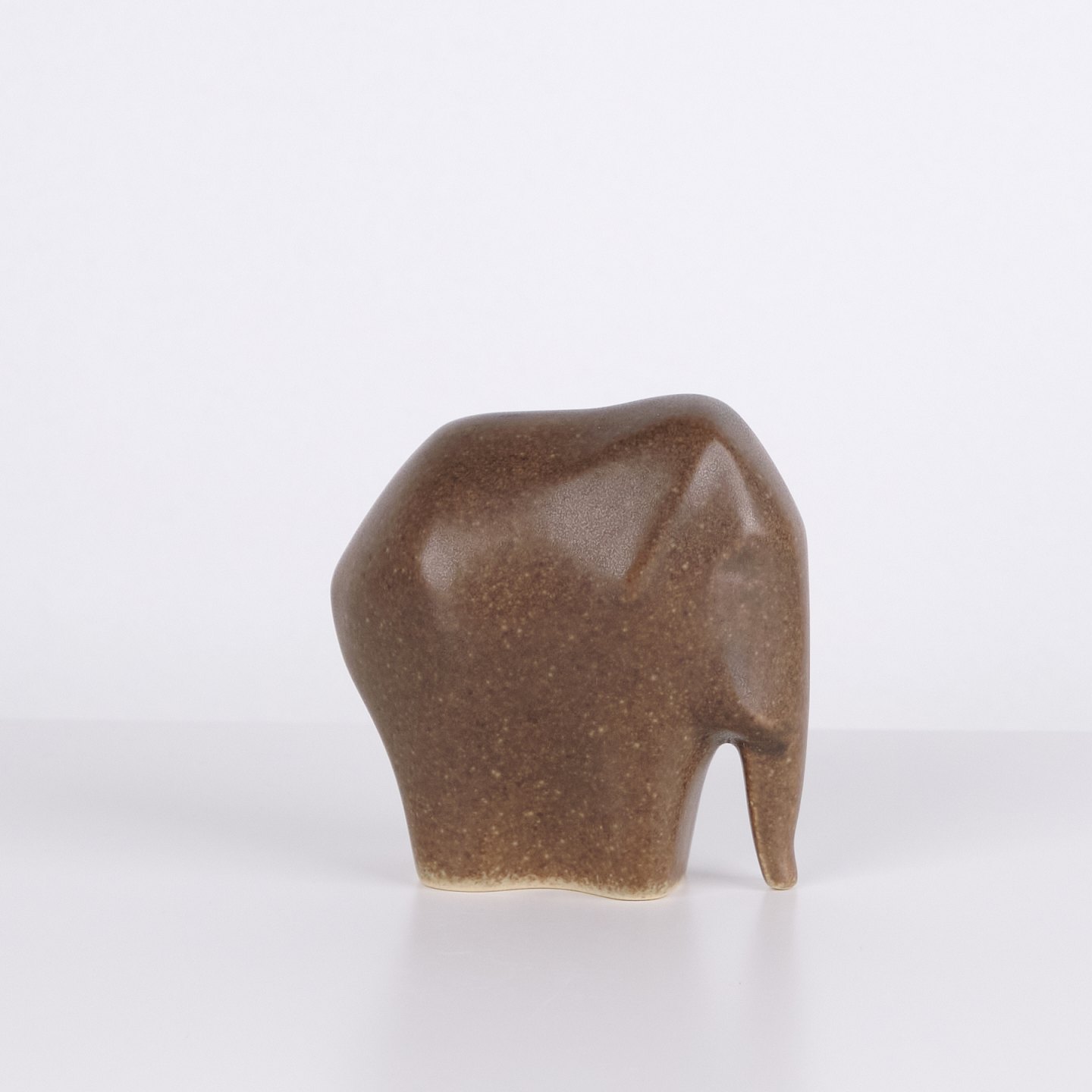 Elephant figure by Knud Basse made in brown glazed ceramic. The figure is modeled in a simple compact form with downward curved trunk and rounded sides. Minimalist model from Knud Basse’s series of animal figures, produced in Denmark in the 1960s.
