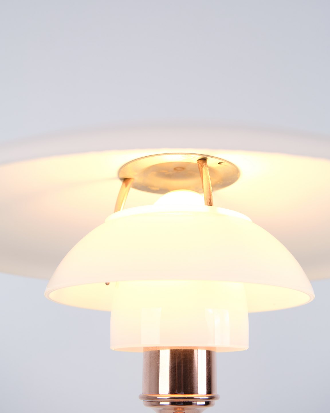 PH table lamp model PH 3½-2½ Limited Edition designed by Poul Henningsen and manufactured by Louis Poulsen. The lamp is made of copper with top shade in white opal glass and two lower shades in white opal glass. The model was sold for a limited period in 2015.