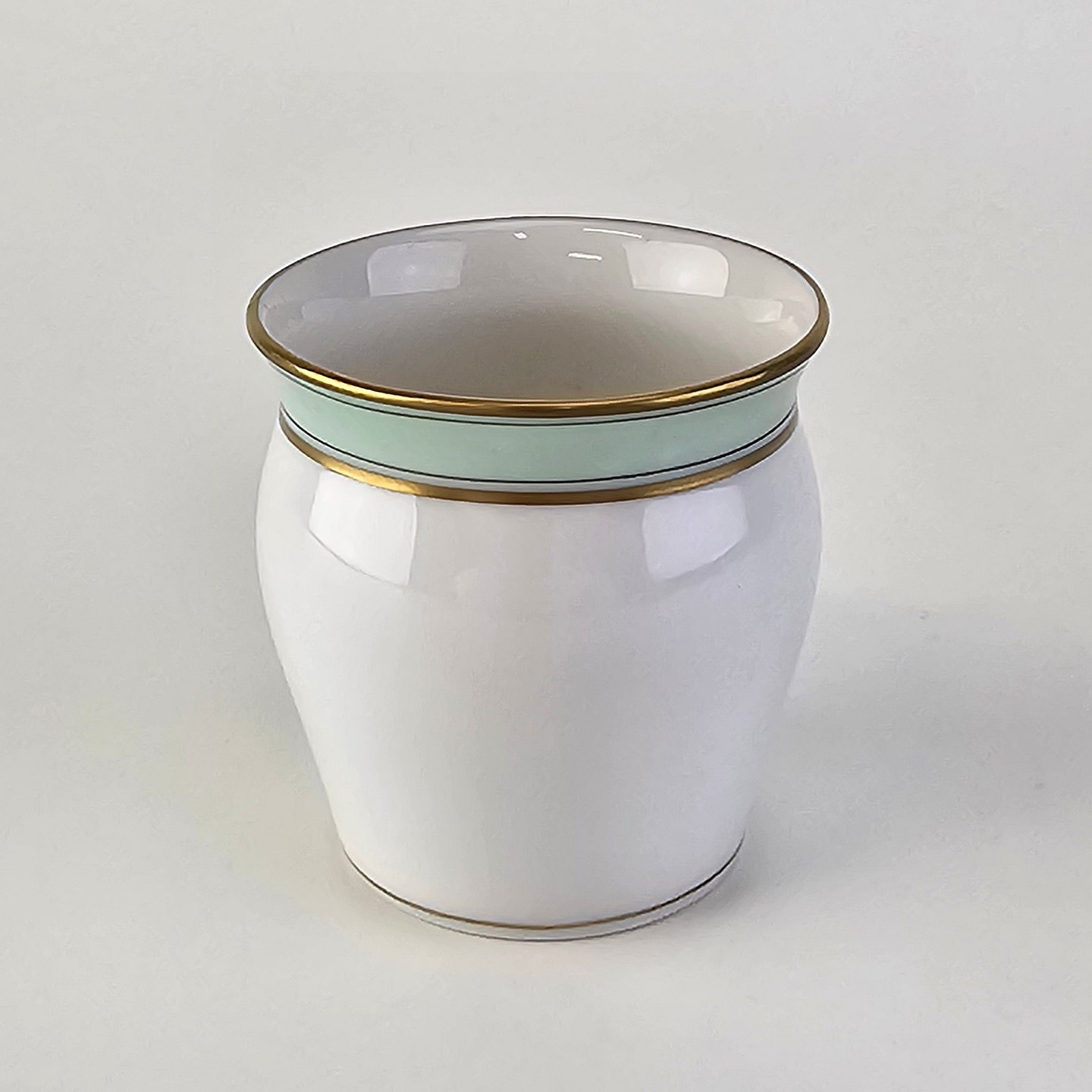 Service i glat hvidt porcelæn med mintblå dekoration og dobbelte guldkanter