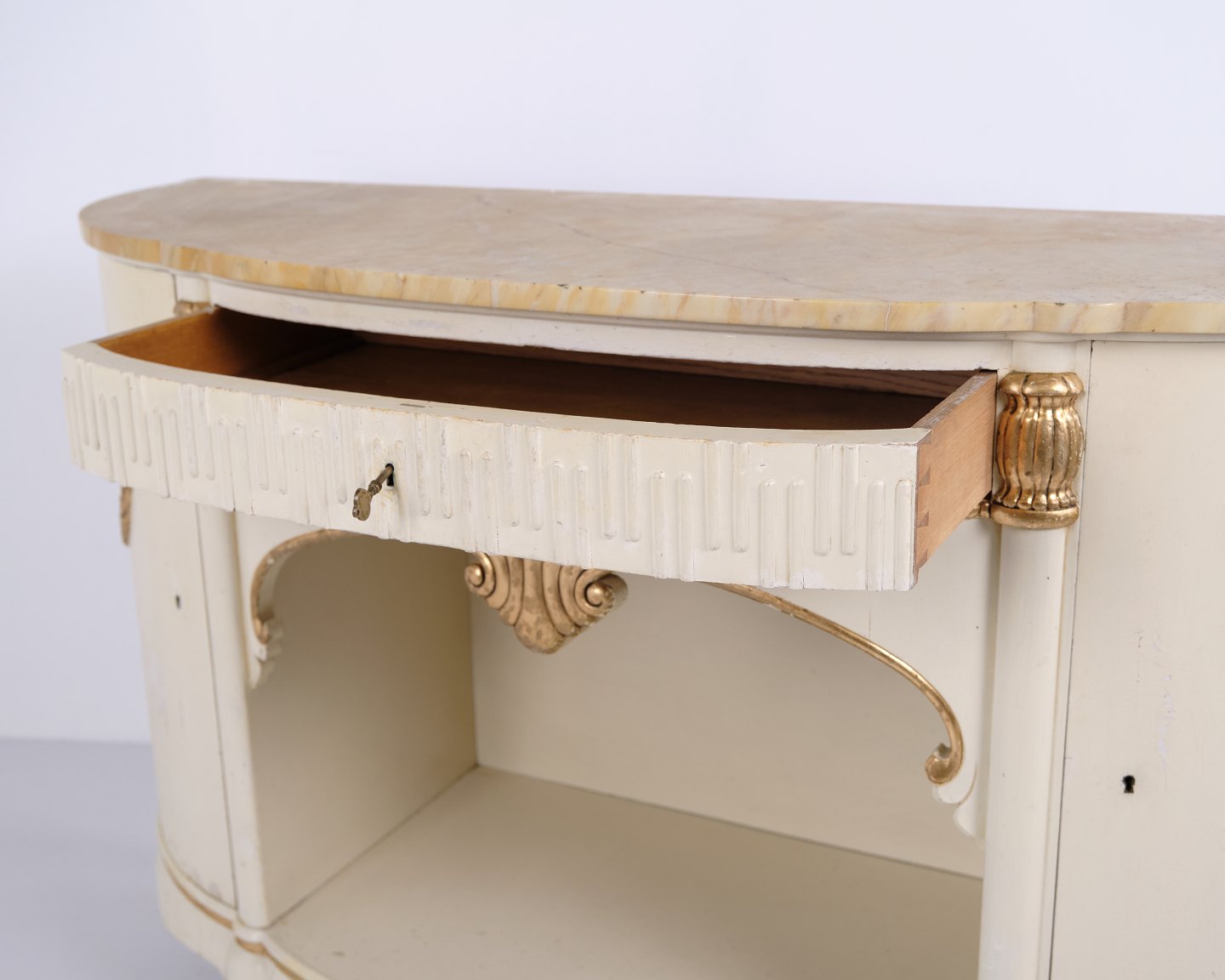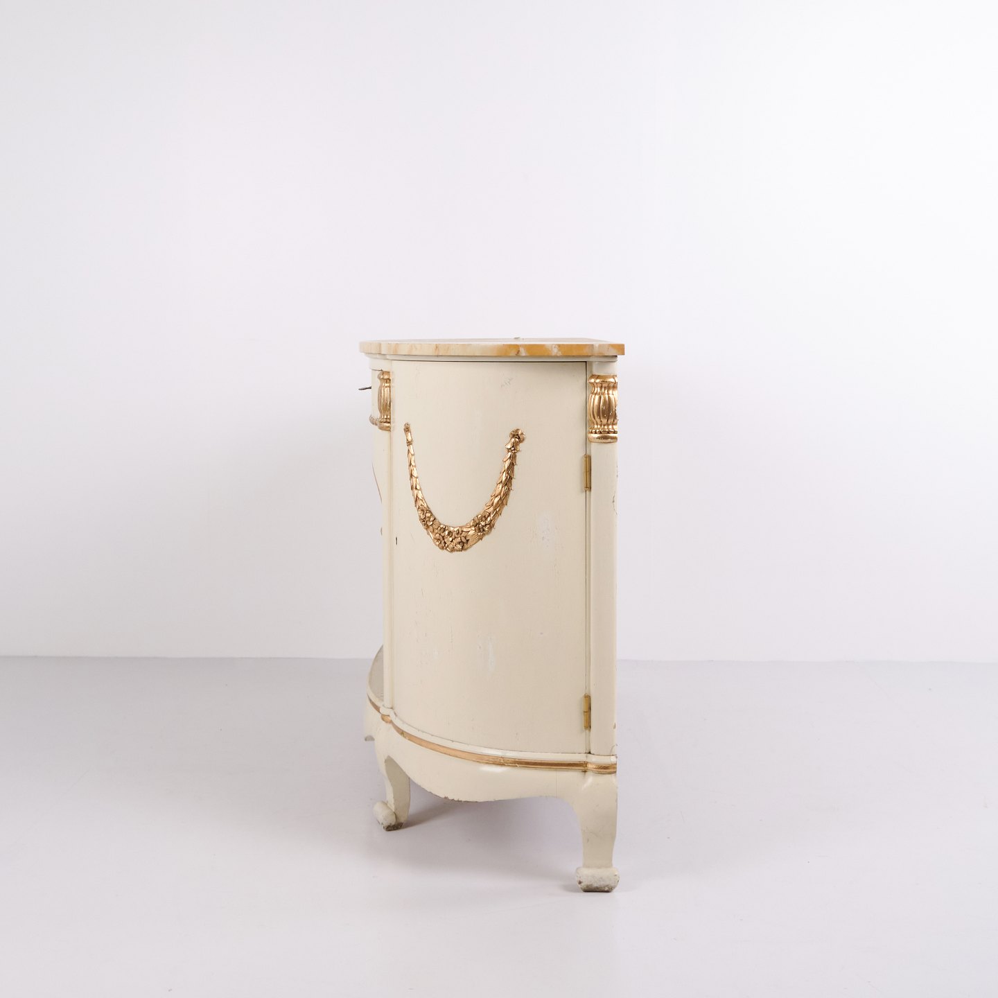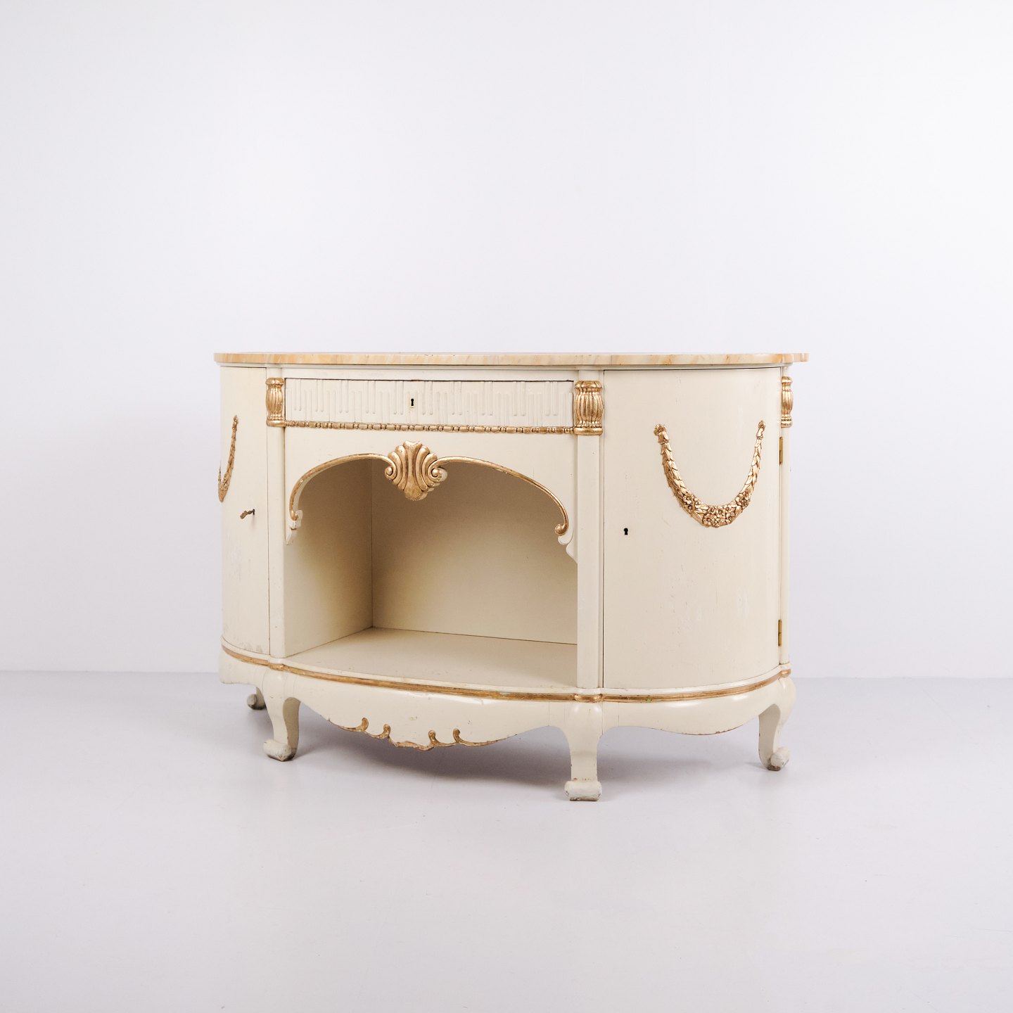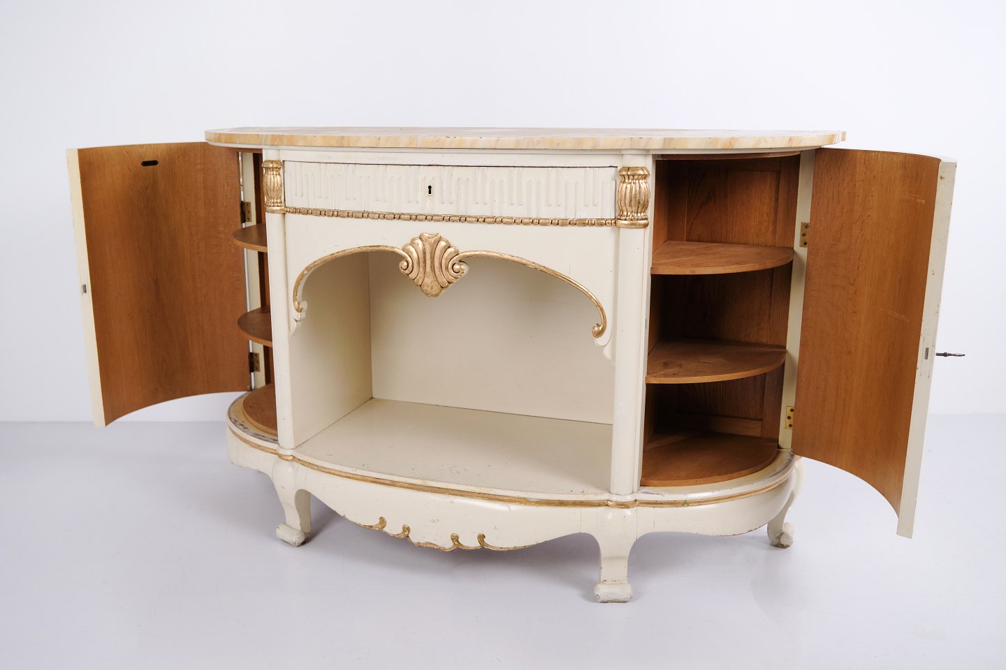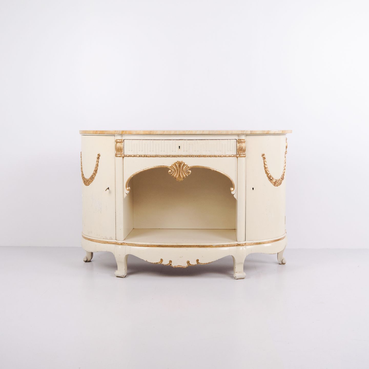 Curved sideboard produced by P. Svensen, N. Frihavnegade 15, Copenhagen. The piece is made of painted wood with profiled details, gilt decorations and original marble top. The front features an open central niche, small drawer and two curved cabinets with interior shelves. Classic Empire-inspired form with curved sides, shaped legs and decorative fittings. Suitable as an entrance hall piece, console or storage sideboard.