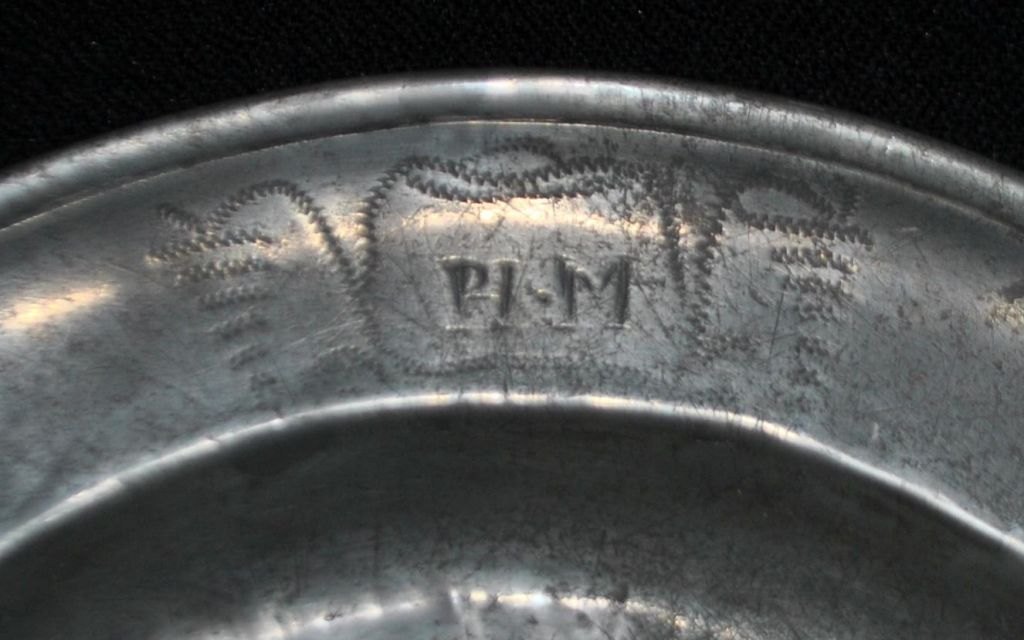 Pewter dish, 18th century. With stamps and engravings. Engraving on the front: PH.M and floral decoration. On the underside: P. G 1832. Unclear master stamps. Diameter: 29 cm.