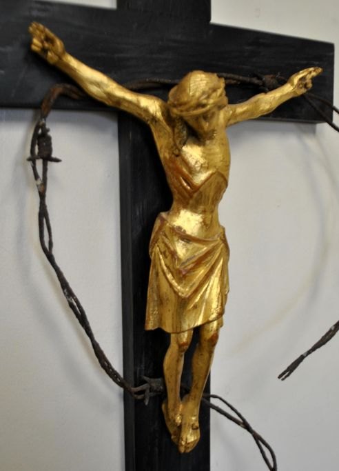 Gilded wooden figure, Christ on the cross, 20th century. Hand-carved. Figure suspended on black-painted cross with barbed wire. Signed. H.: 41 cm. W: 24.5 cm.