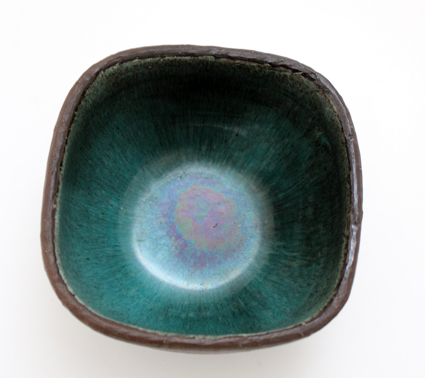 Flot og yderst sjælden firkantet skål nr. 423 i grønmeleret glasur indvendig og rå keramik yderside fra OSA keramik. OSA keramik var et kortvarigt samarbejde mellem Aase Feilberg, Chr. Frederiksen og Gutte Eriksen. Værkstedsfællesskabet varede fra 1941-1942. Skålen er i flot stand. Højde 9 cm. 14 x 14 cm. Pris: 2500 kr.