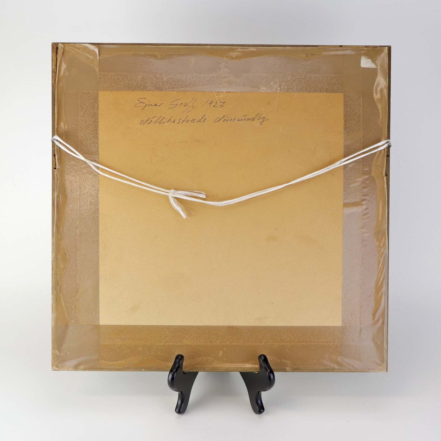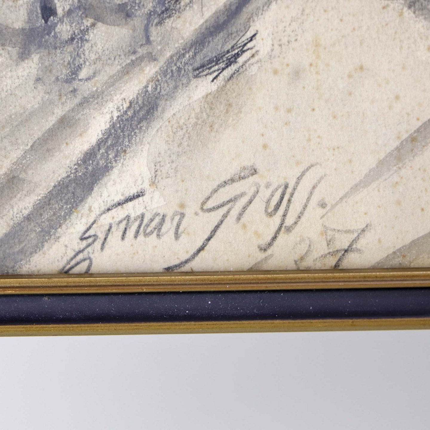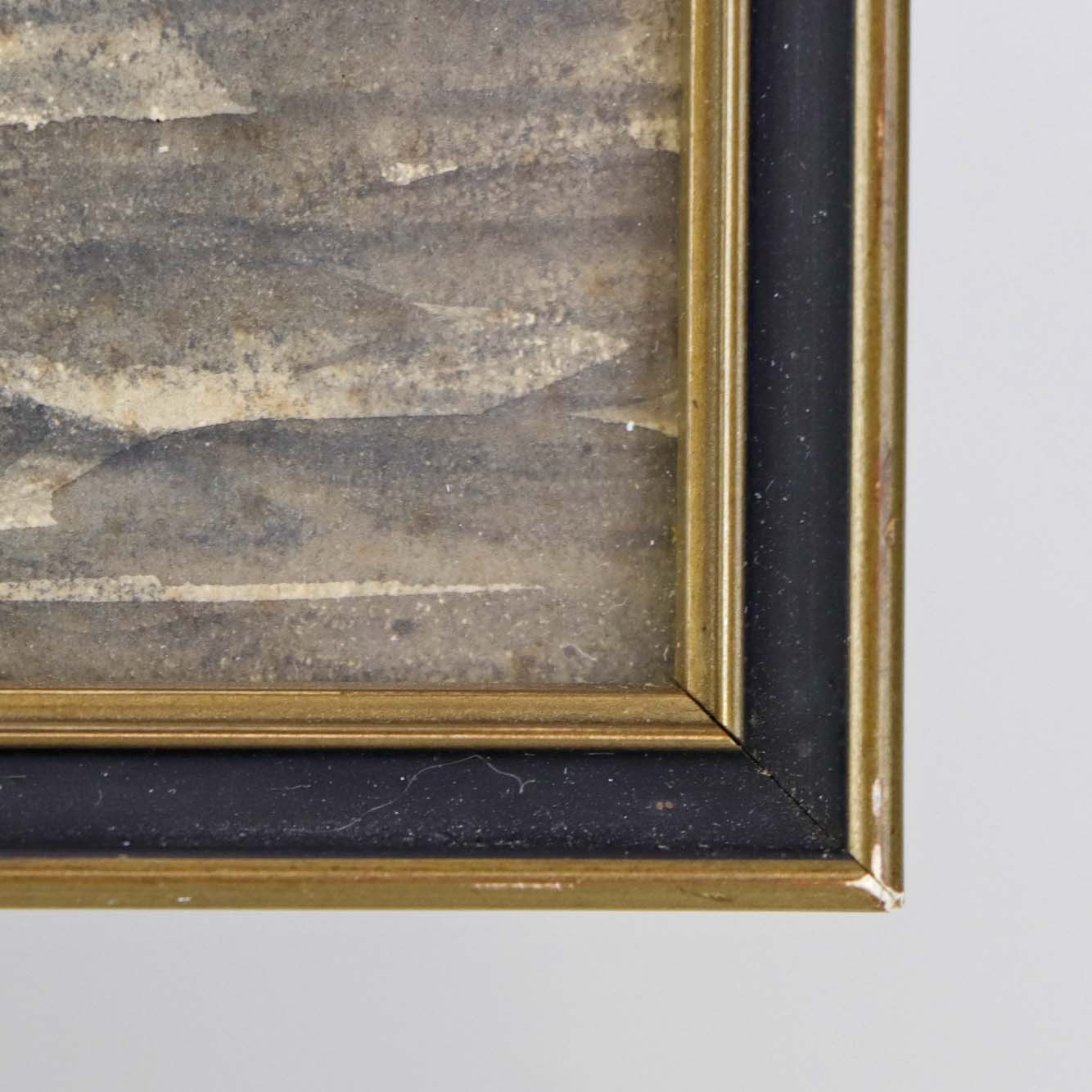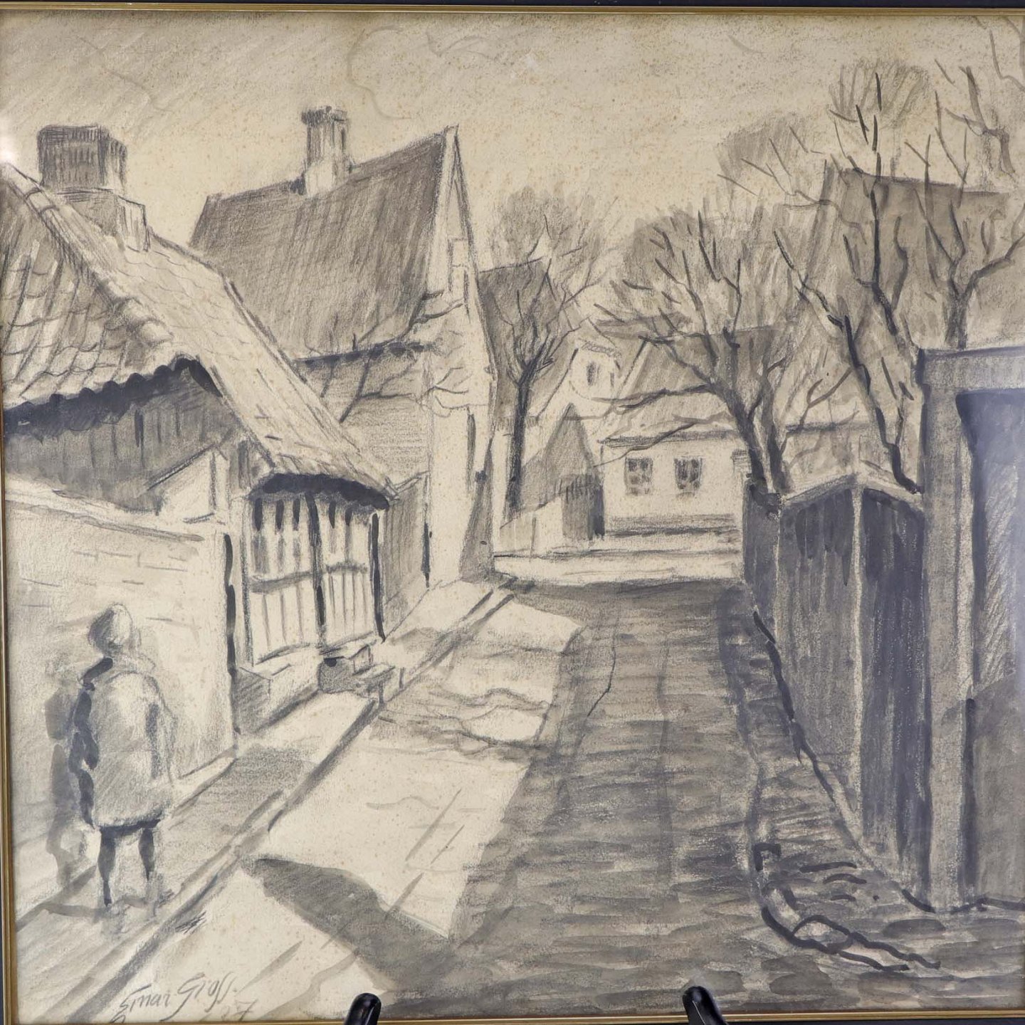 Indrammet akvarel og kultegning på papir i sortmalet træramme med bymotiv af Nellikestræde i Nørresundby fra år 1927