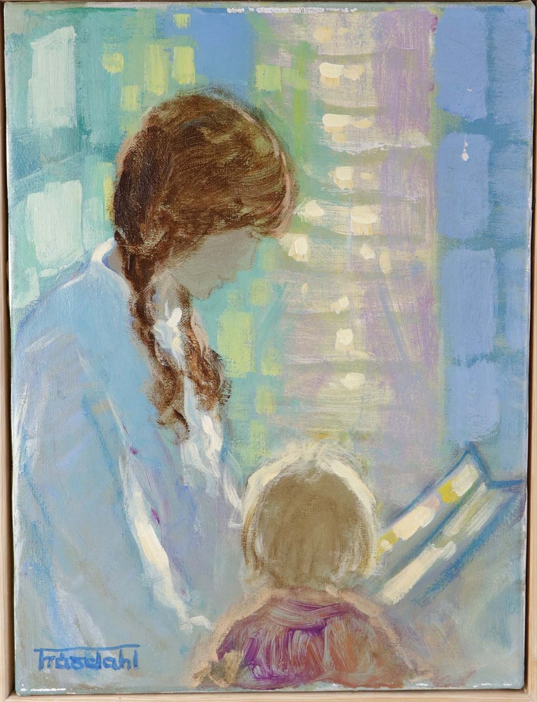 Maleri med olie på lærred i træramme. Et portrætmotiv i lyse pastelfarver af mor med barn.