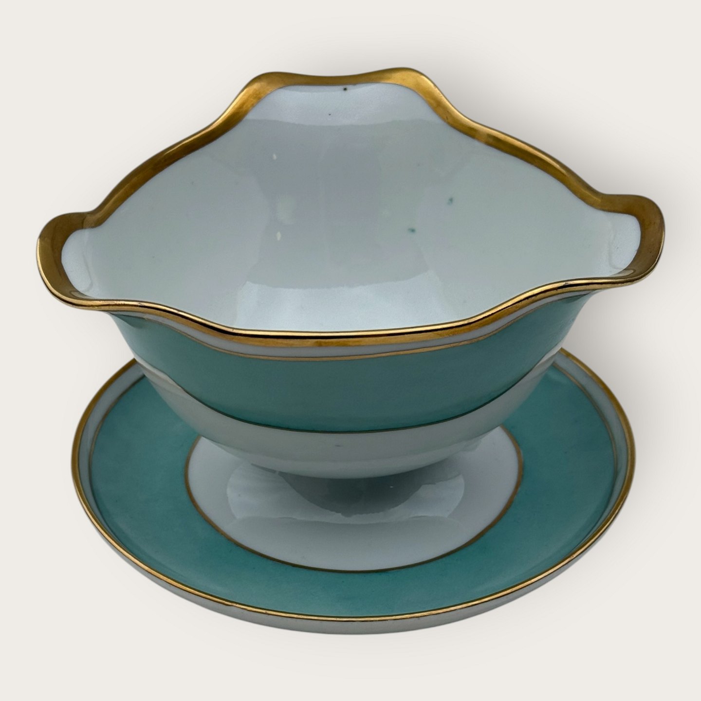 Bing & Grondahl, Form 643 with wide turquoise decoration and gold rim, Sauce bowl, 10.5cm high, width 17cm, 2nd grade, *A few small marks under the glaze (see photo) otherwise good condition*