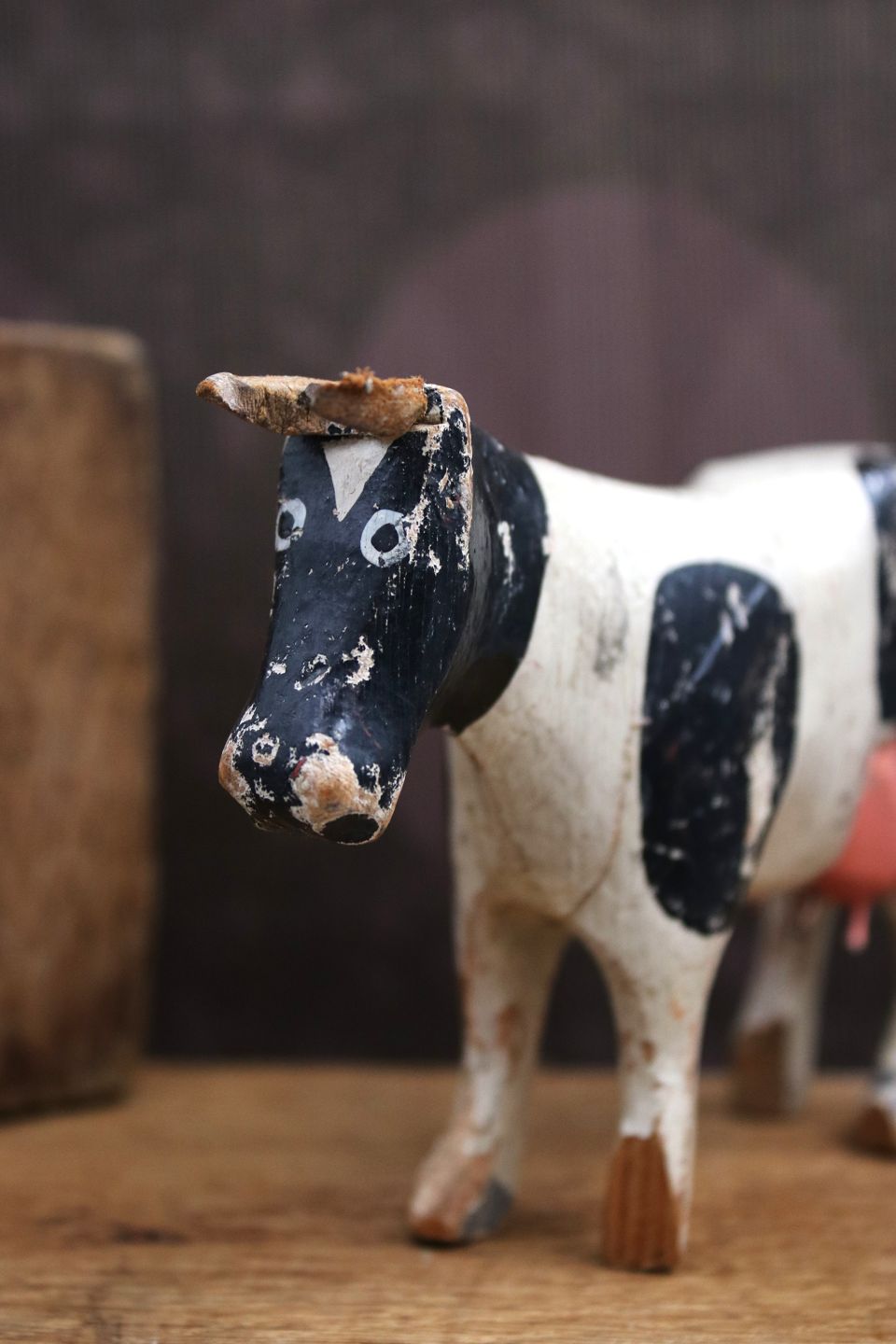 Decorative, old dairy cow in carved wood with fine original painting, horns and tail in leather...