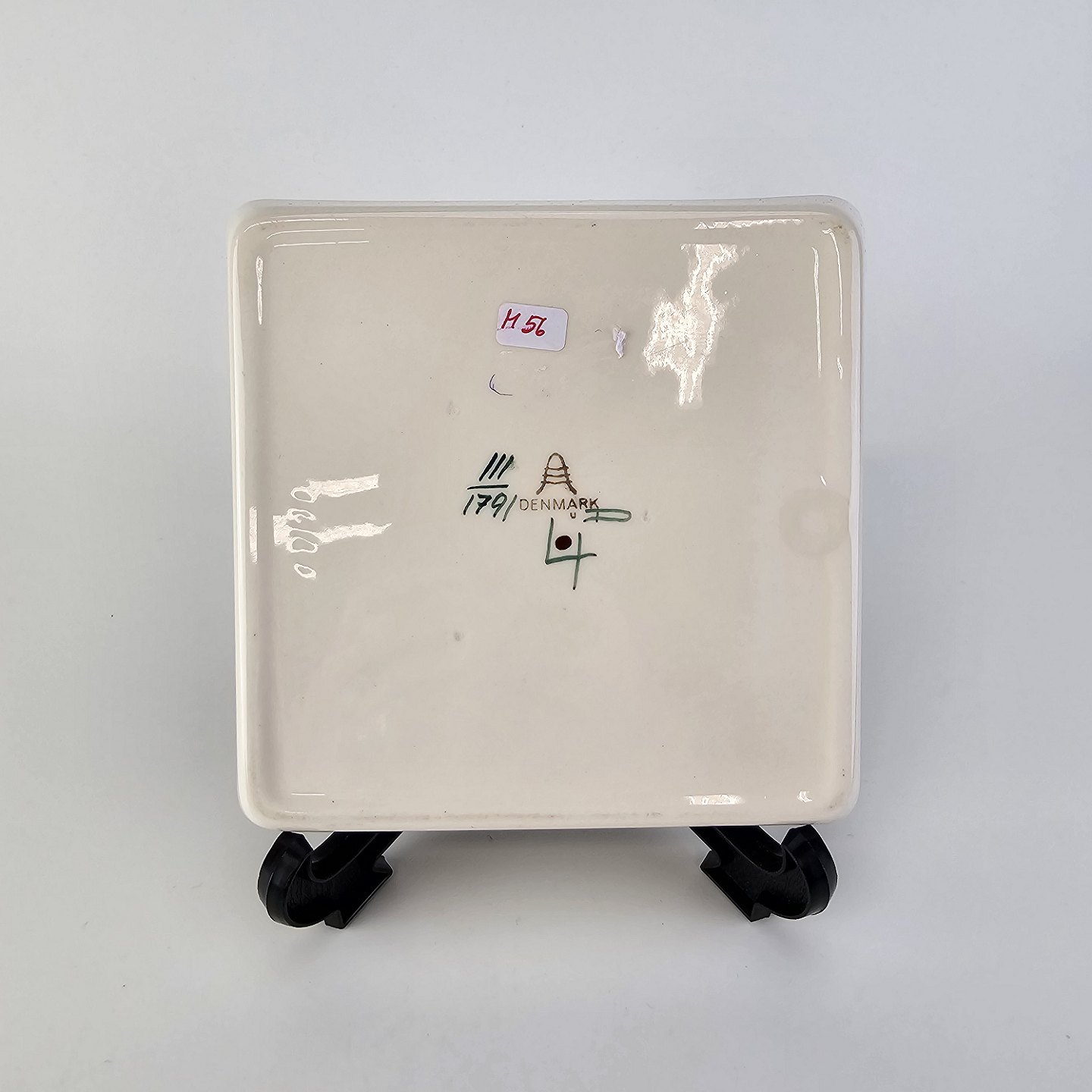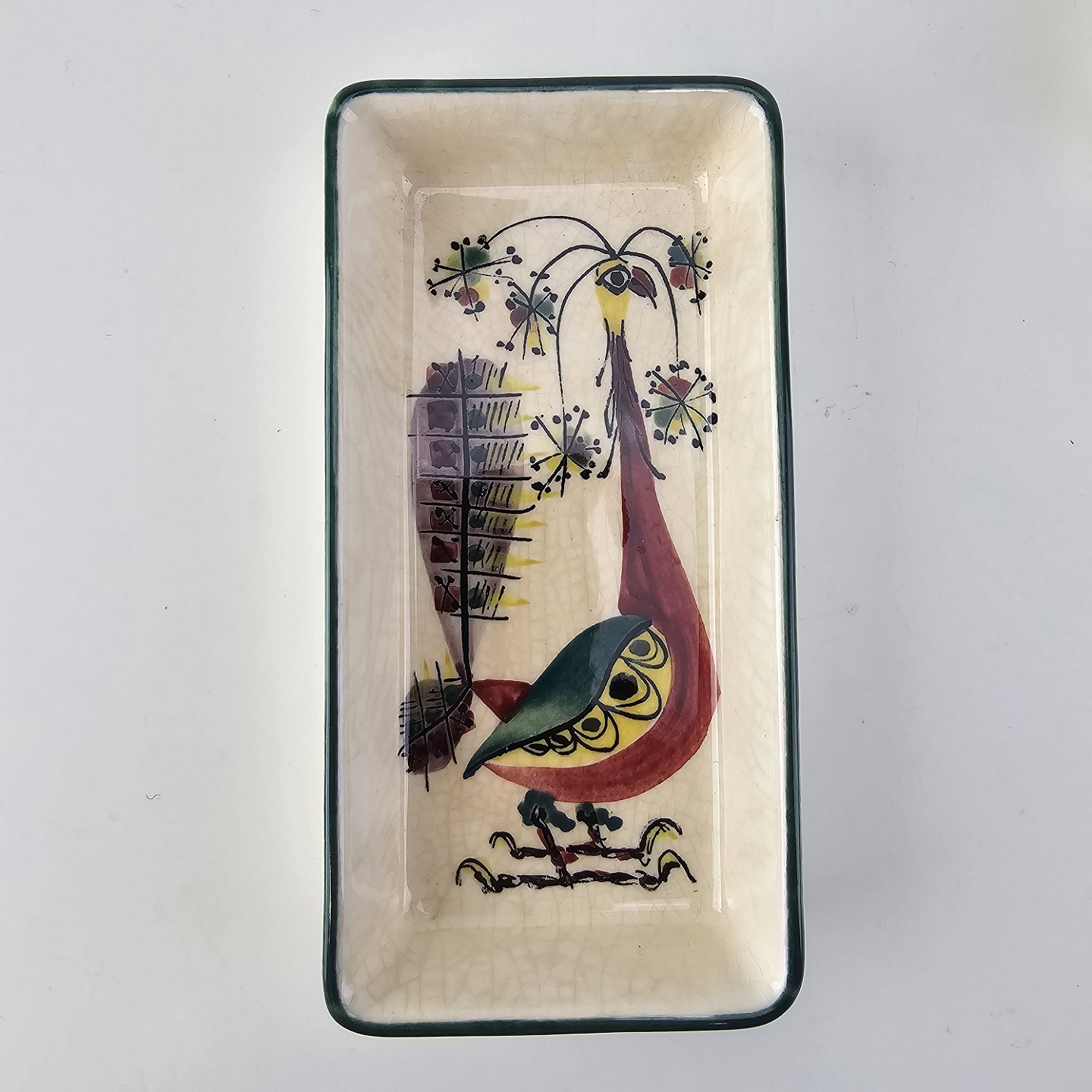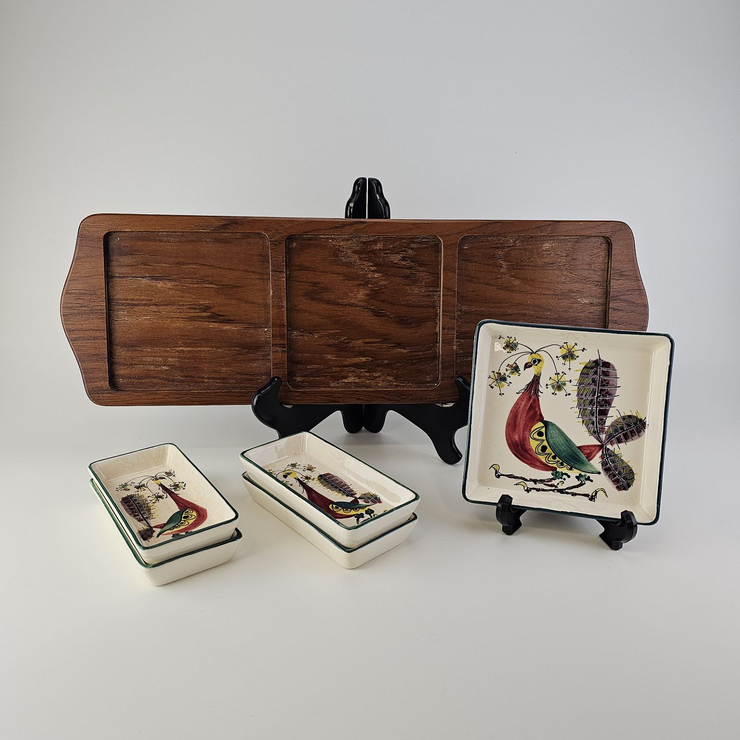 Text available in Danish: Cabaret fad fra serien Tenera med bakke i teak træ og fem små, firkantede fade i fajance med dekoration af påfugle