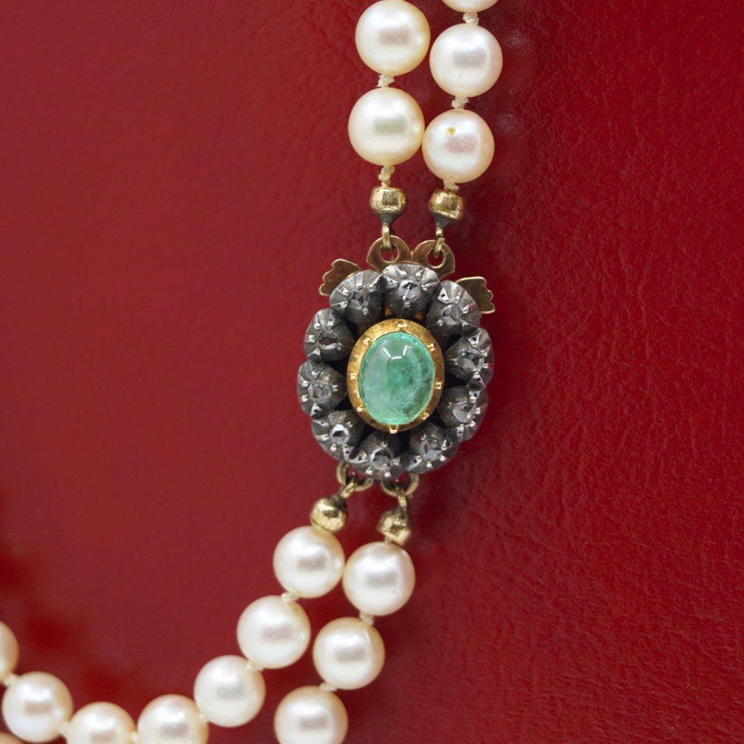 A double pearl necklace, with clasp of 14k white gold and gold, adorned with diamonds and an emerald.