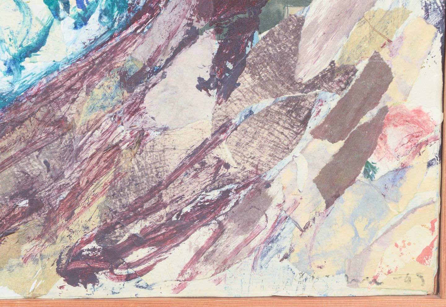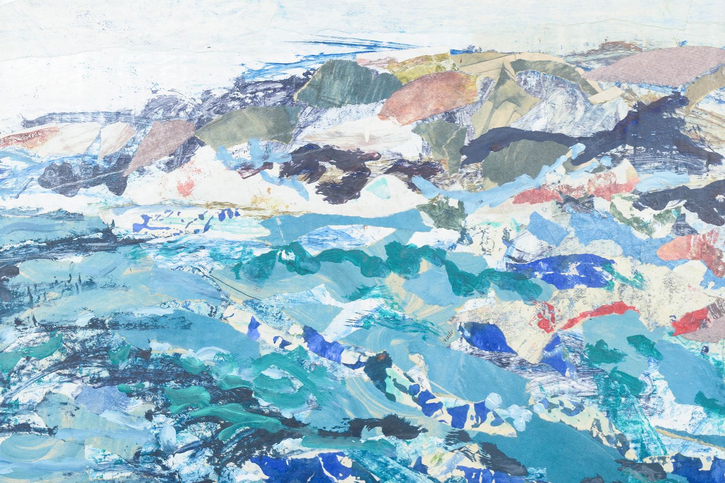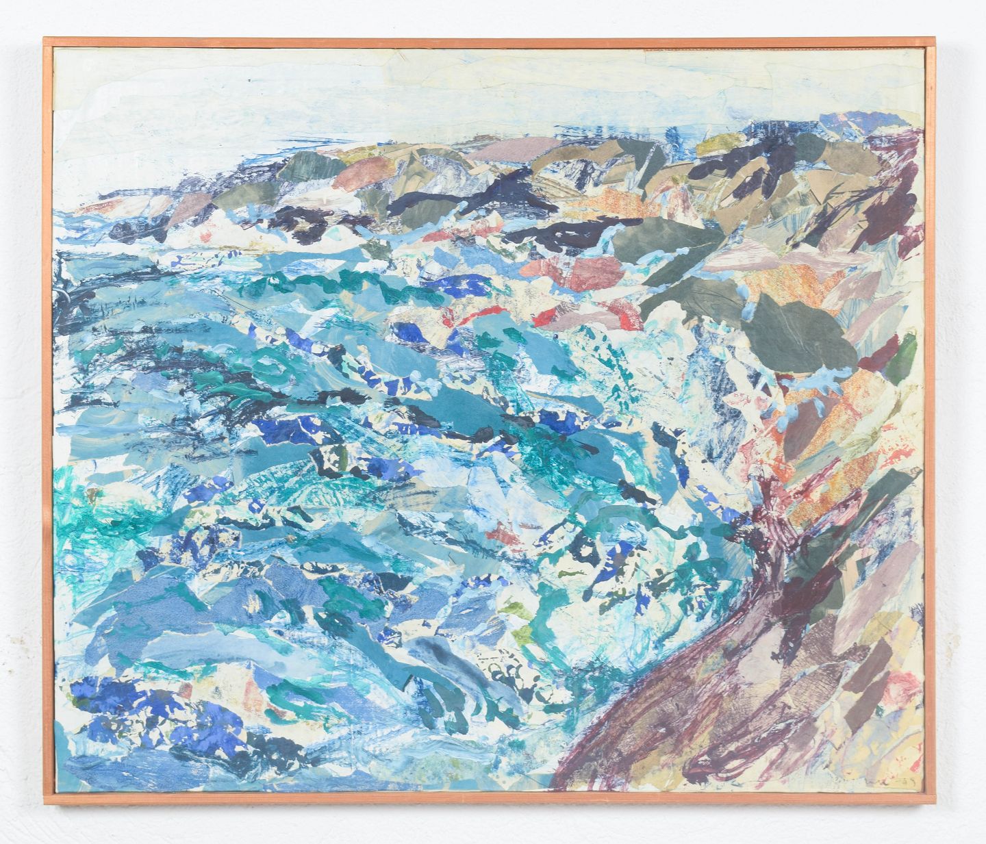Expressive coastal motif from the Swedish archipelago with dynamic brushstrokes and layered fields of color in blue, green, and earthy tones. The composition is executed in mixed media on board and appears signed and dated 1969.