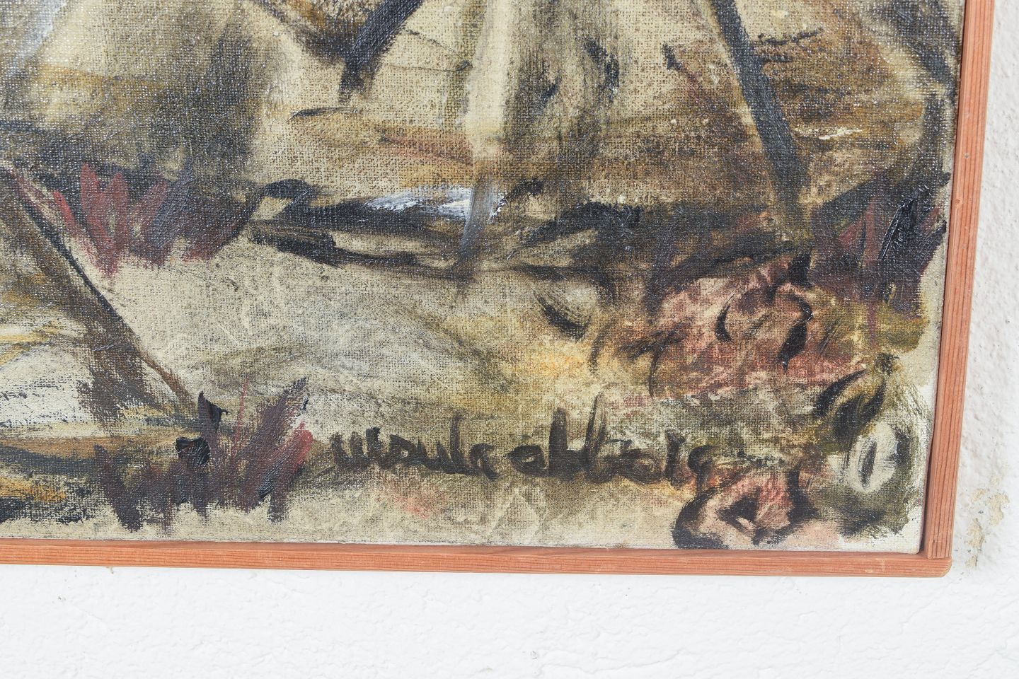 Modernist landscape motif from Lapland depicting Sámi tents in an expressive and slightly abstracted composition. Executed in subdued earthy tones with a free brushstroke, signed.