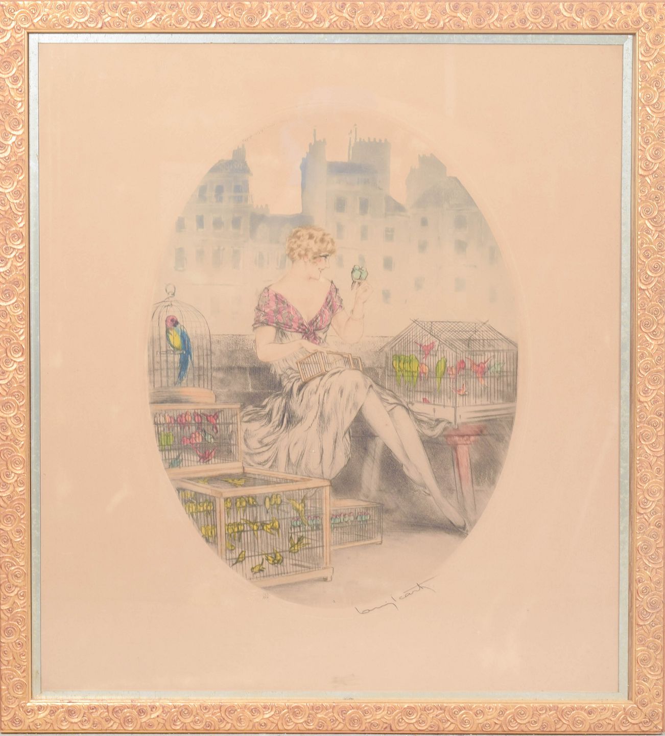 Louis Icart, etching, listed French artist. "Bird Seller"