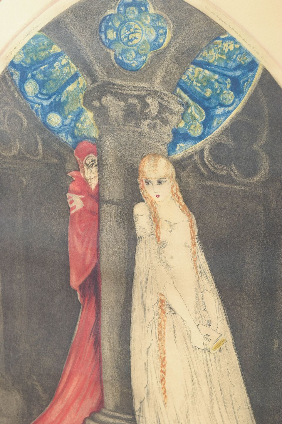 Elegant and atmospheric composition featuring two figures within an architectural setting, executed in Icart’s characteristic Art Deco style with refined linework and soft tonal transitions. Signed in pencil and numbered 70. Dated 1928.