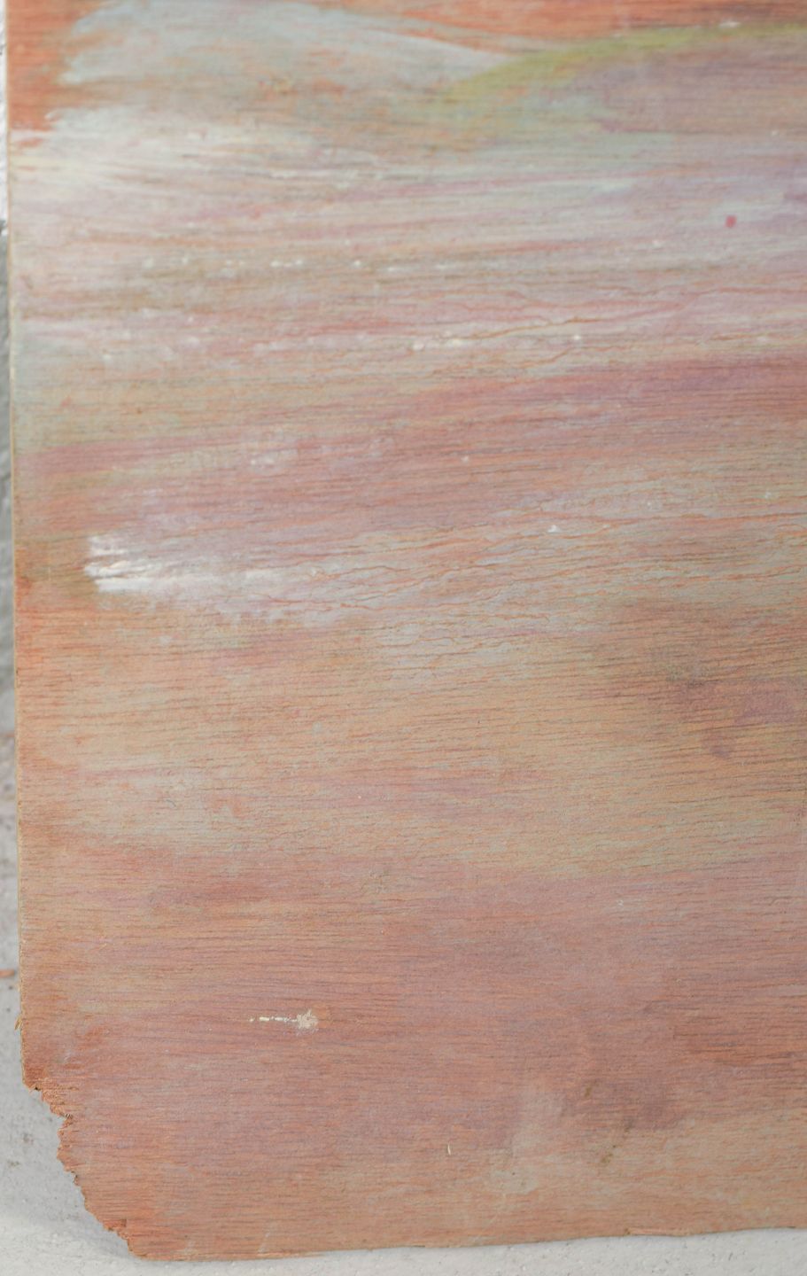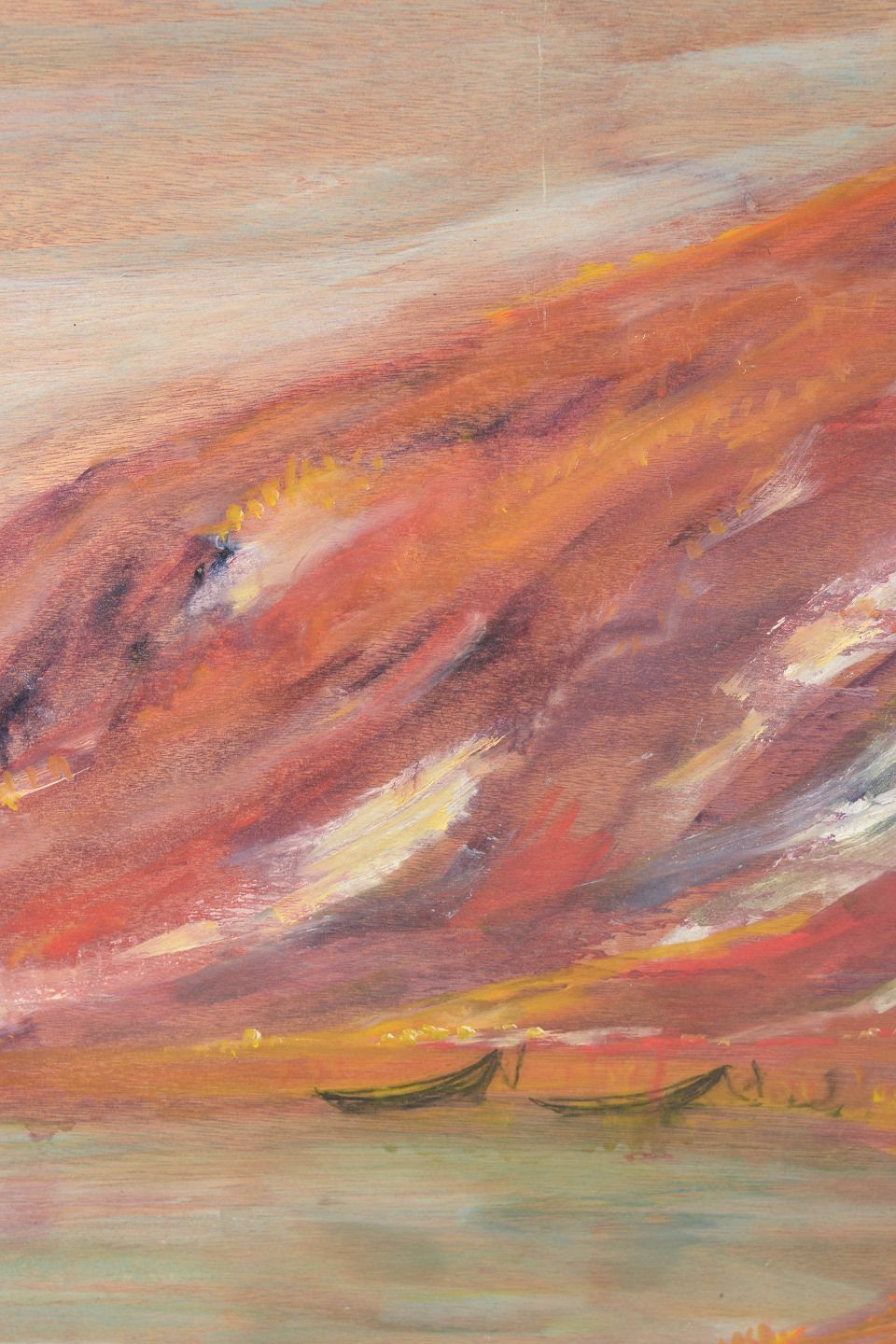 Modernist composition with an abstracted landscape motif in warm earthy tones and expressive brushwork. Oil on board, signed.