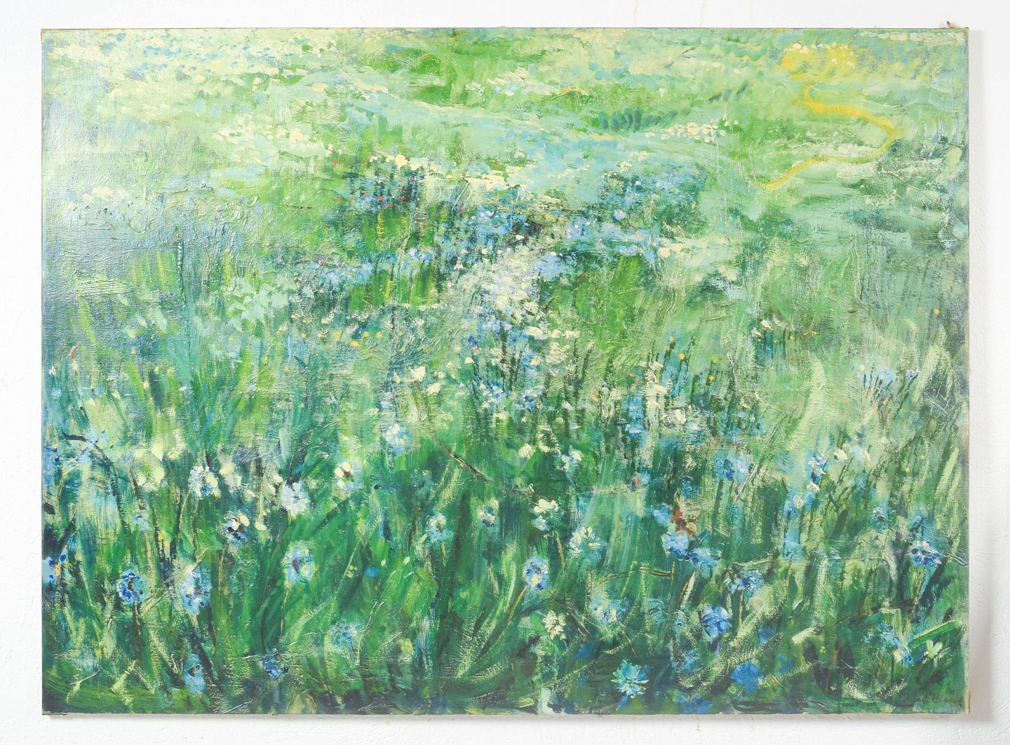 Expressionist landscape depicting a flowering field rendered with loose and vibrant brushwork. The composition conveys a light and atmospheric quality, dominated by green and blue tonalities. Painting of high quality. Signed.