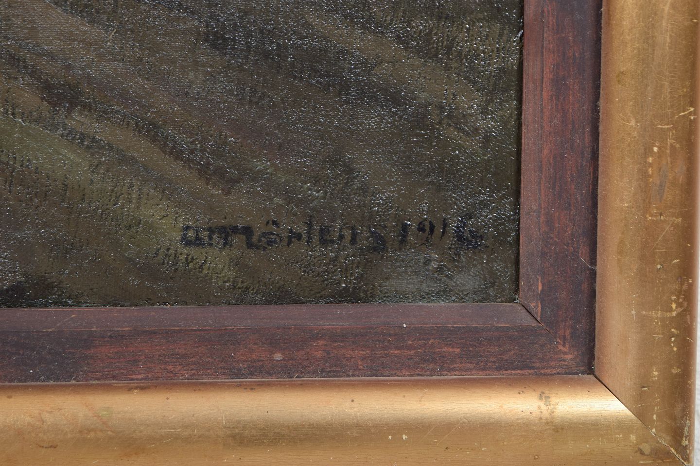 Landscape composition executed in a naturalistic and atmospheric style with deep, saturated colouring. The painting is signed and dated 1916.